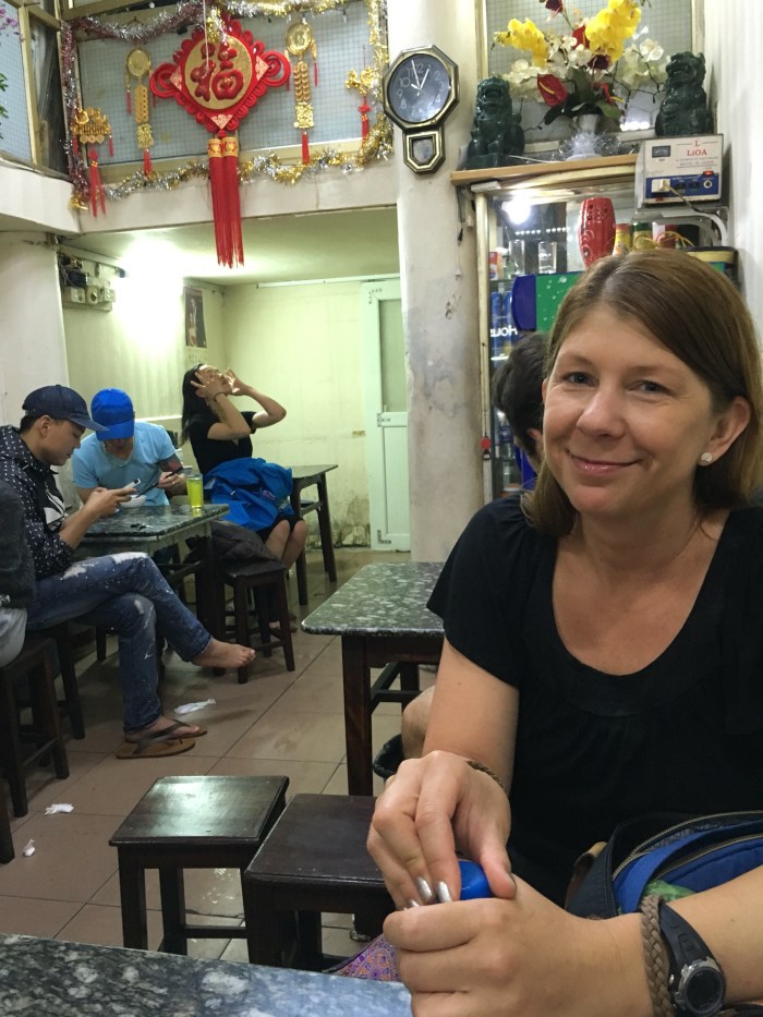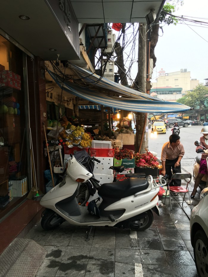 There were some hiccups on day one, in addition to the near hotel scam. In our first couple hours here walking the city, a biker ran into Amy. I’d say it was a somewhat gentle nudge, as we were walking on the street & he was turning a corner very slowly & we were all trying to squeeze together, but it was a bit of a surprise to her. Later, a street vendor, carrying what appeared to be a shoe repair kit, approached Amy with a glue stick aimed directly for her shoe before she reacted strongly with a “no”. I think he was probably just looking for money as if he “repaired her shoe”. Another vendor later, snuck up behind me with her wooden shoulder bar bearing 2 baskets of fruit & without me seeing, attempted to place it on my shoulder & then asked for money for a picture. I turned, sternly said no & shrugged it off my shoulder. She perhaps would’ve balked were she not worried about it going crashing to the ground, thus losing her pretty fruit displays in the mad Hanoi traffic. The hotel scam, those incidents & the insane traffic would, I think, scare off a lot of people. We just laughed our way through the incidents, didn’t give up on the city & subsequently fell in love with it.
