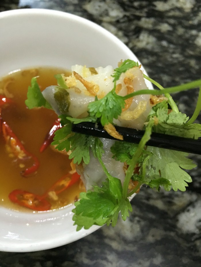 Stop 3 – Long Vi Dung for (1) nom bo kho, beef jerky salad, green papaya, peanut, basil & dipping sauce; (2) banh bot loc, tapioca dumpling so transparent w shrimp, pork & black mushroom & dip in same sauce (4 parts water, 1 part fish sauce, vinegar & sugar). We are only 1 hour in & we’ve had 4 dishes. Belly is bursting but must push on.