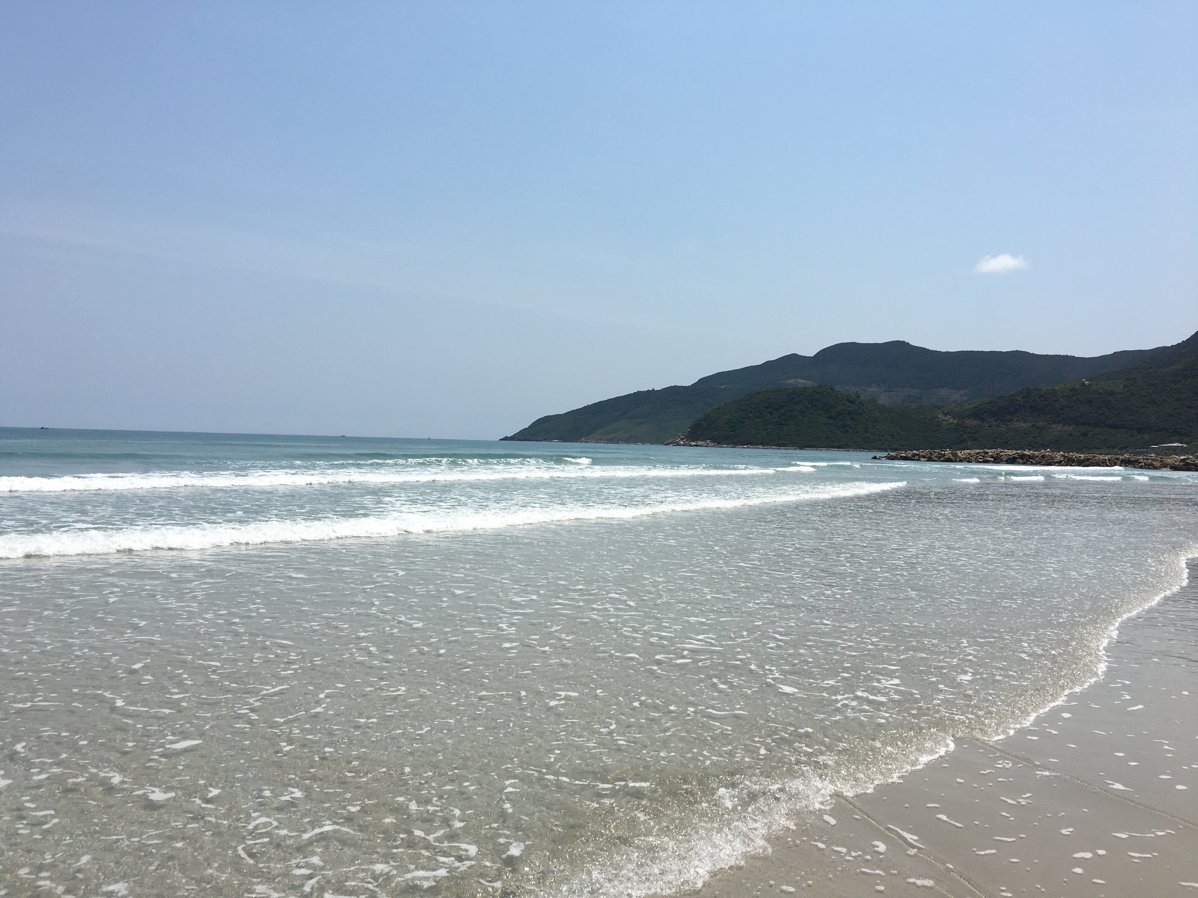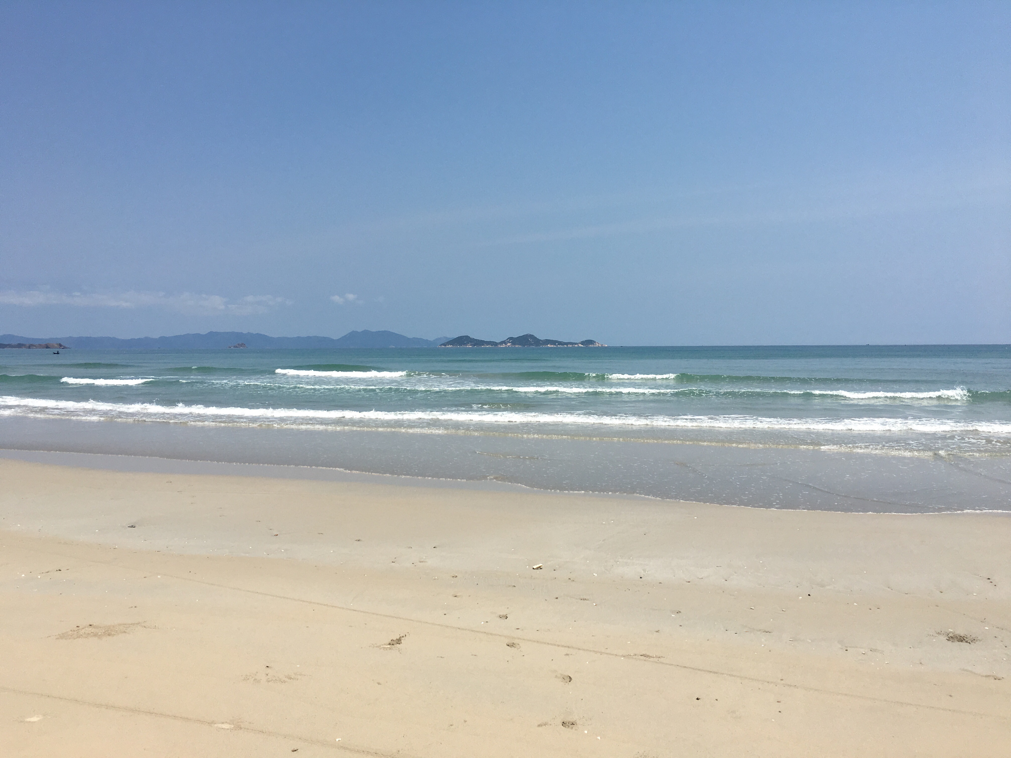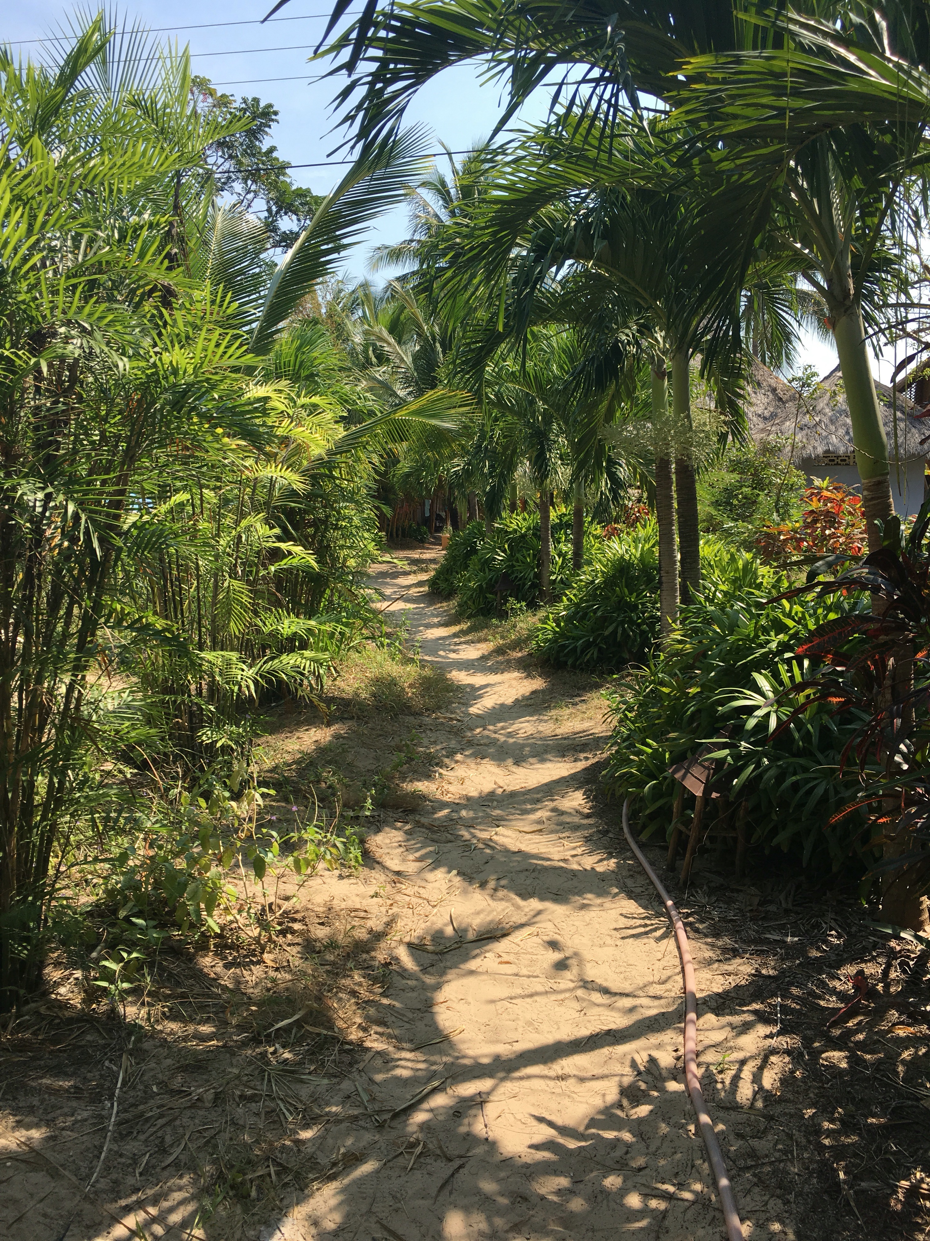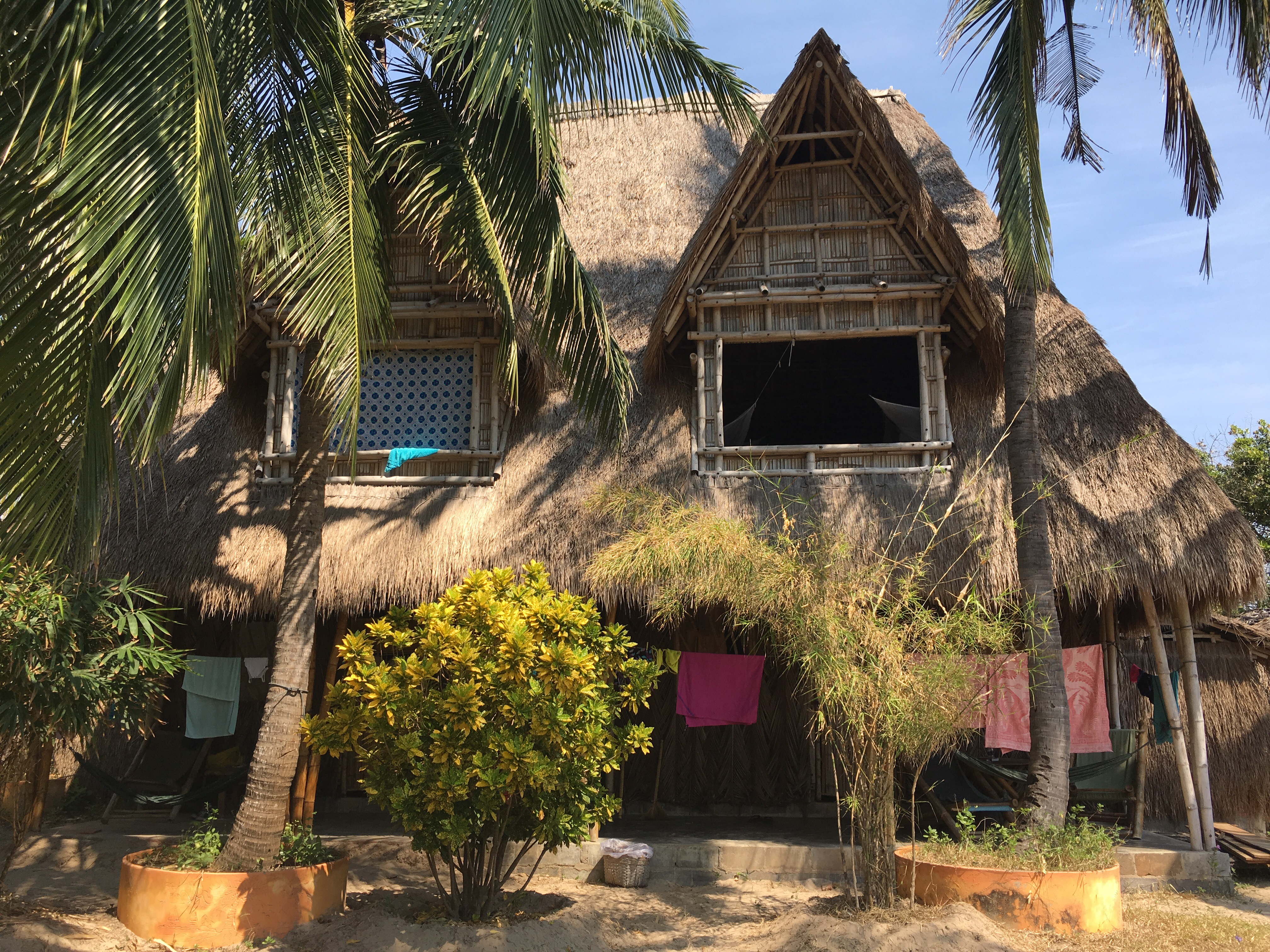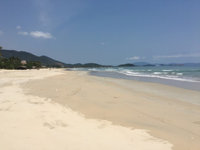 We “made a reservation” the day before arrival which involved me tracking down Sylvio, the French-Canadian now long-time Vietnam resident and Jungle Beach Hut owner, on his cell phone. He said they had room for us but we’d sort out the type of room (ranging from a bed outside w a mosquito net to a 2 BR thatched hut with a private bathroom) and cost upon arrival and he arranged for a car to pick us up at our Nha Trang hotel as it’s an hour+ drive to a quite remote locale. We were all set. The driver arrived at 9am and we arrived at Doc Let, in the middle of nowhere, by 10am to find Sylvio, shirtless, tanned and hairy, demanding our passports and then giving us a quick 5 minute tour of the place, including its common dining room, shared bathrooms, and all of the available accommodations. We decided on a 2 BR with private bath as it cost us an additional $10 over 2 nights. By 10:30, we were on the isolated 18km beach, featuring the most glorious soft white sand, crystal clear blue water and gentle warm waves, perfect for swimming.
