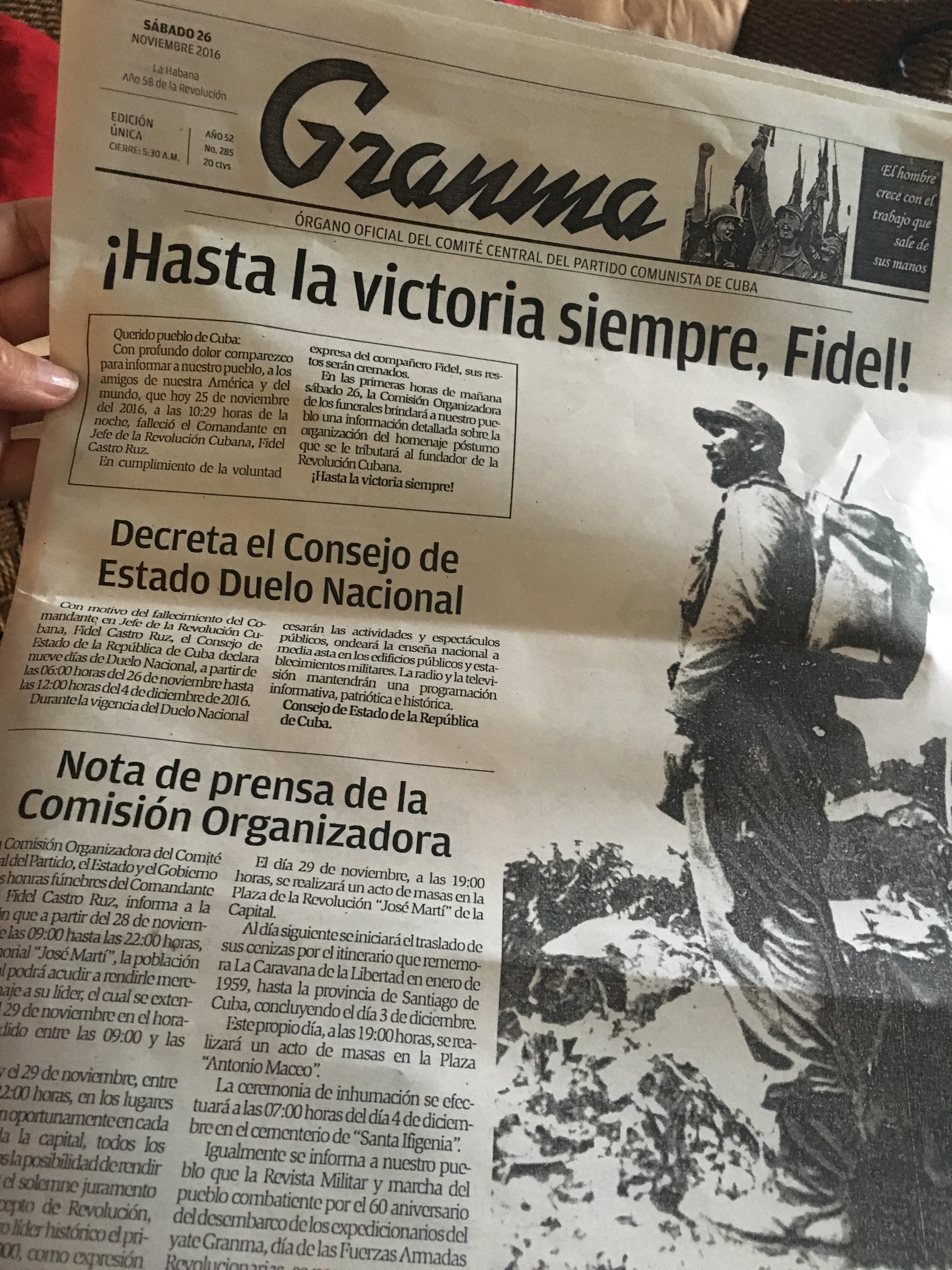 My casa owner shared w me the state newspaper, the Granma (named after the boat that brought Fidel, Che & Raul to Cuba to start the revolution – 3 of the 12 out of 80+ that survived the initial landing), which was wholly focused on Fidel & despite only being 8 pages, it took me 2 hours to read. Thanks shitty Spanish. The owner was laughing at me. But I think I eventually understood most of it. It just took me awhile bc there were a lot of words I didn’t know (he was no help… his accent is brutal & speaks zero English) so I re-read many sentences to try to glean context. So I know what’s going on. For the most part. I was going to ask if I could perhaps keep it but he seemed to be keeping a close eye on it. I learned there’s a period of mourning over the next 9 days during which state radio and television will broadcast patriotic and historical programming before his funeral in Santiago de Cuba on Sun Dec 4. There’s a big ceremony in Havana on Tues in revolution park where I visited. Then his ashes will caravan from Havana to Santiago, taking the same reverse route he took after his victory speech in 1959, before a similar ceremony on Dec 3 in Santiago & his burial on the 4th. I’m going to do my best to be there.