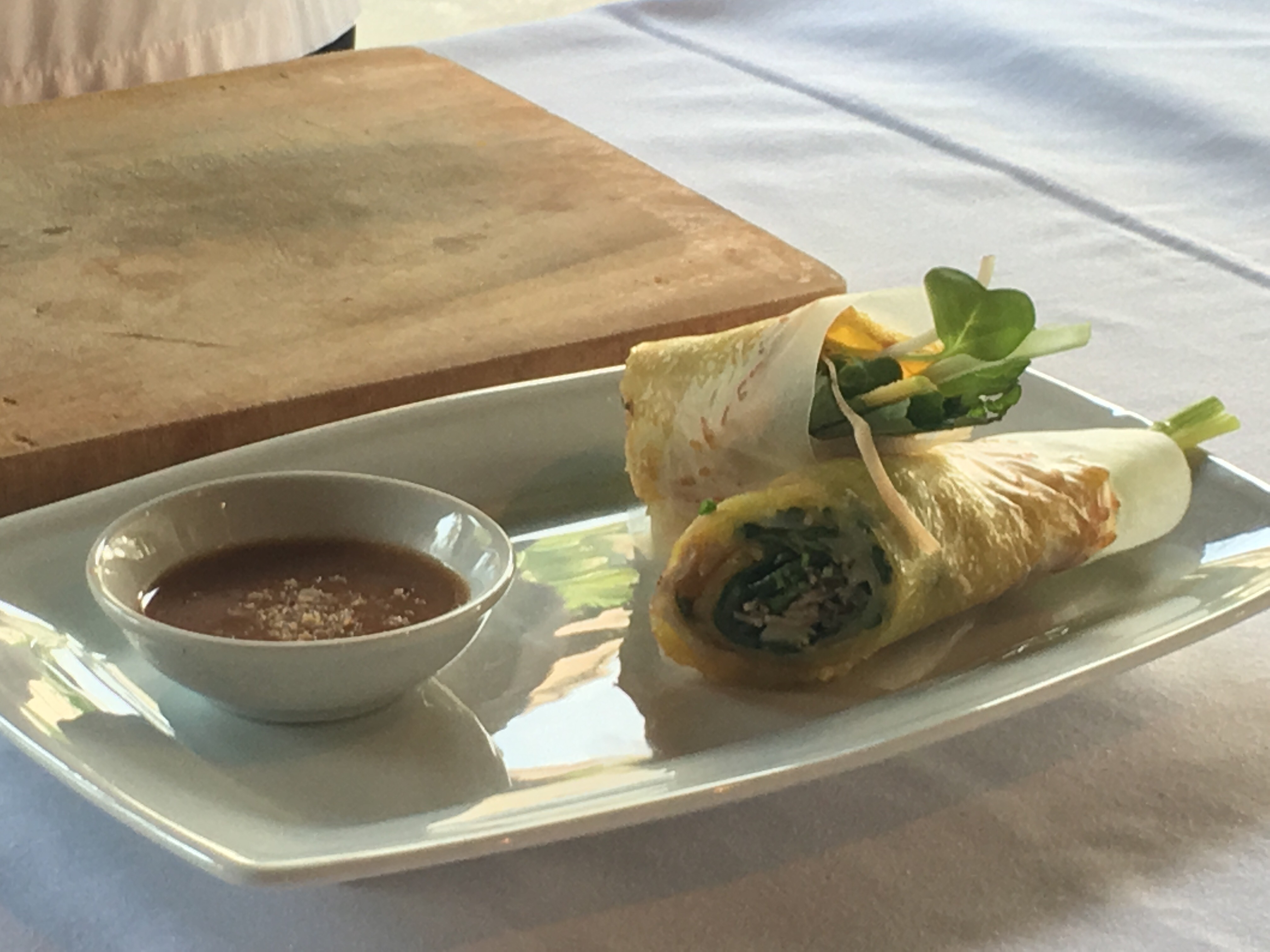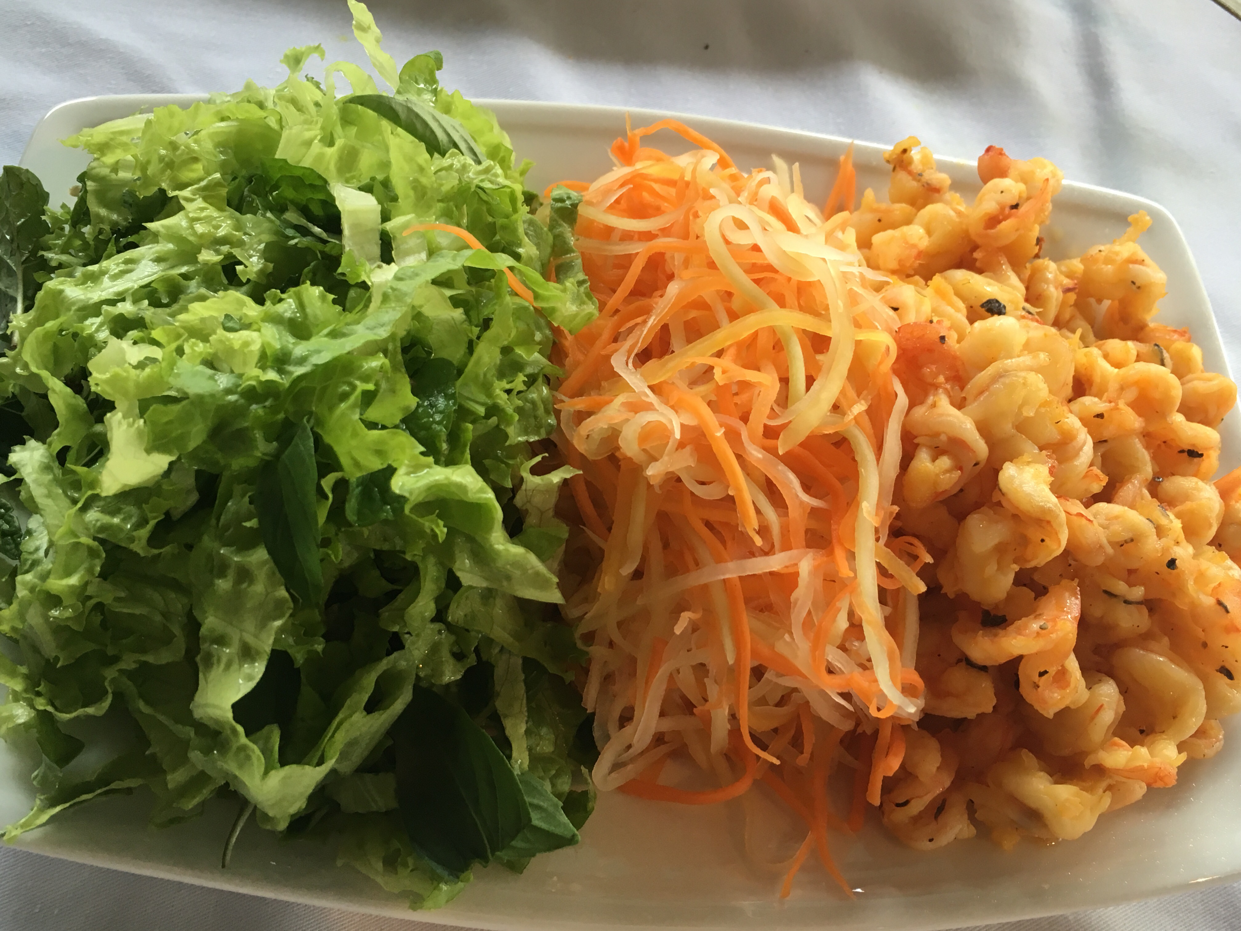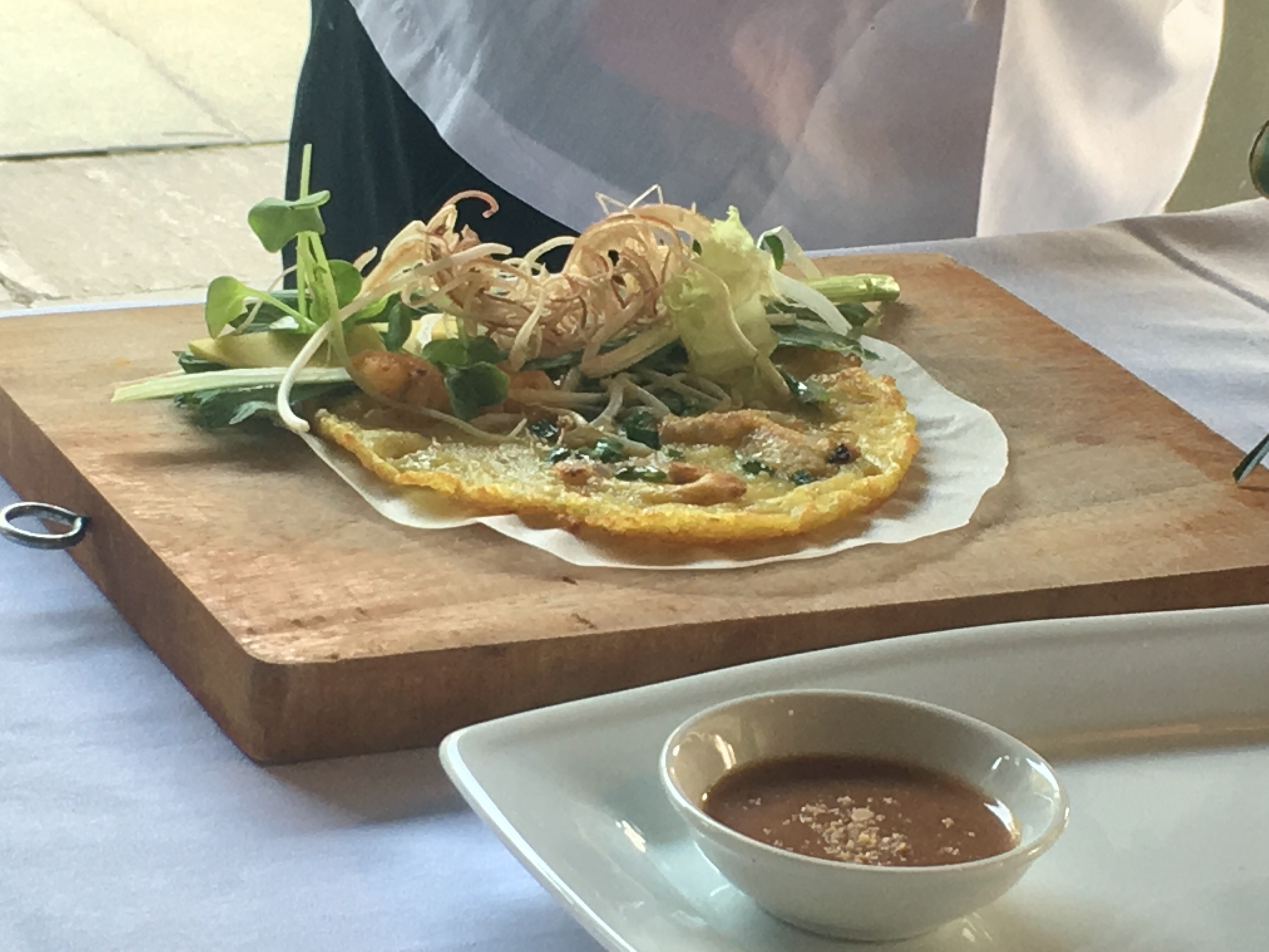Pancake w rice flour, veggies & greens, prawns as demonstrated by our chef/teacher Mimi