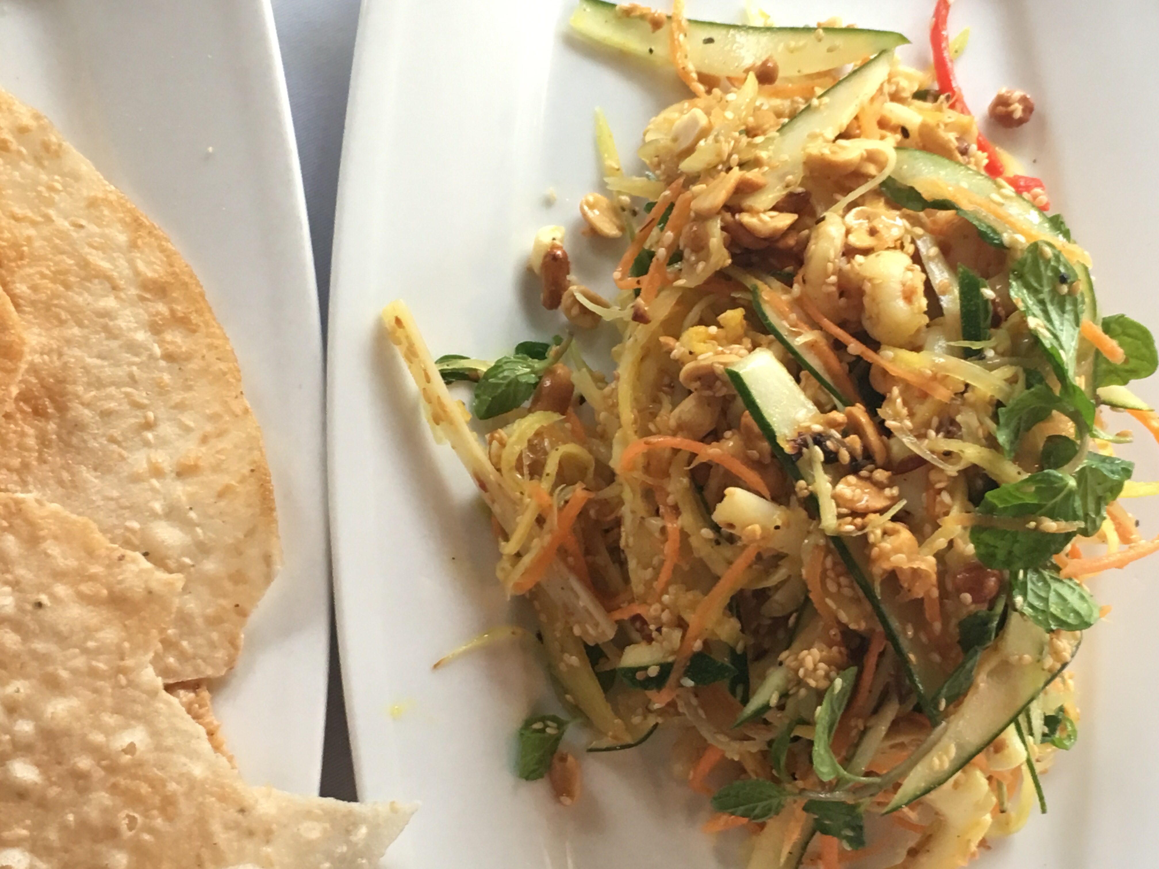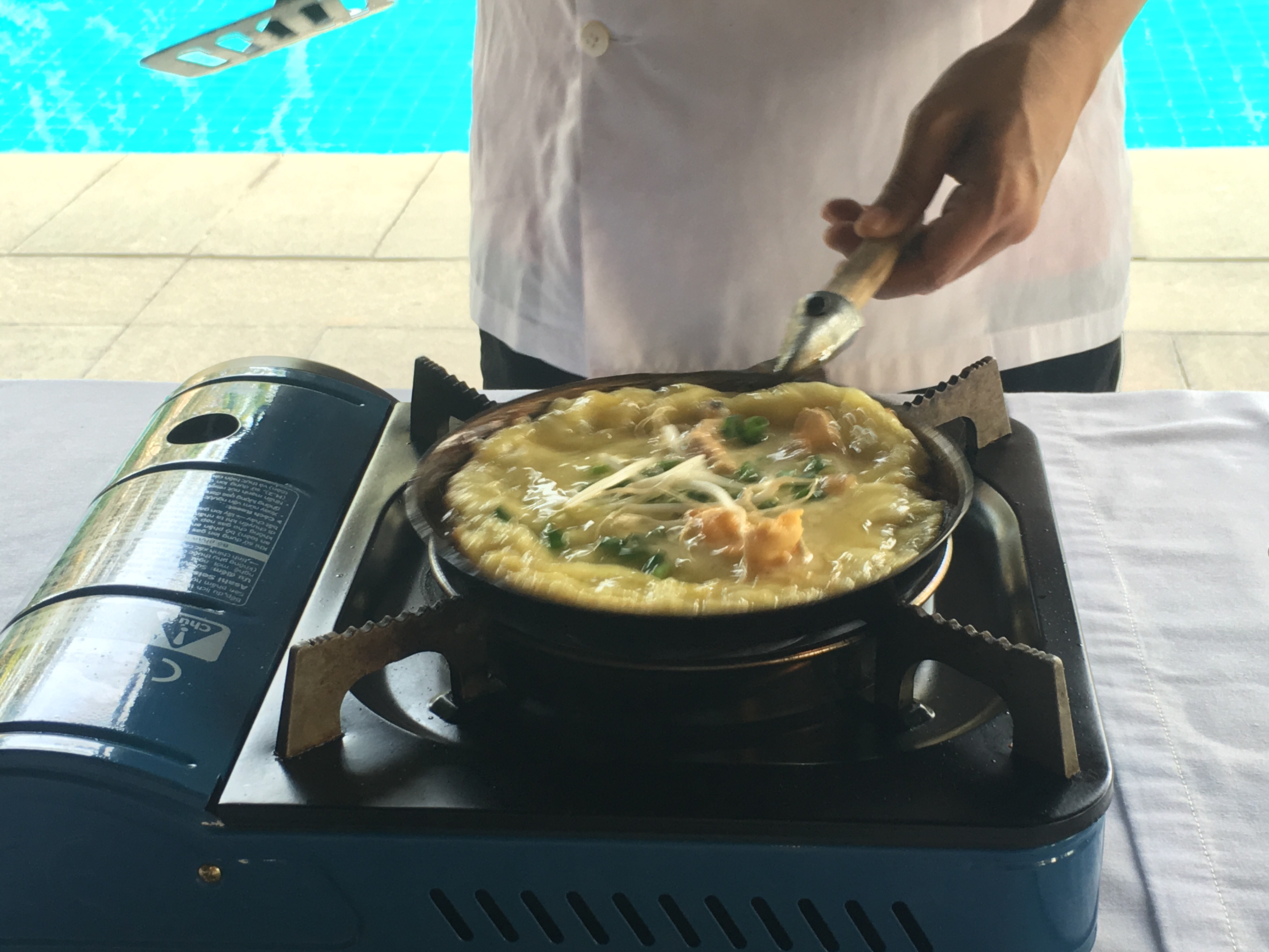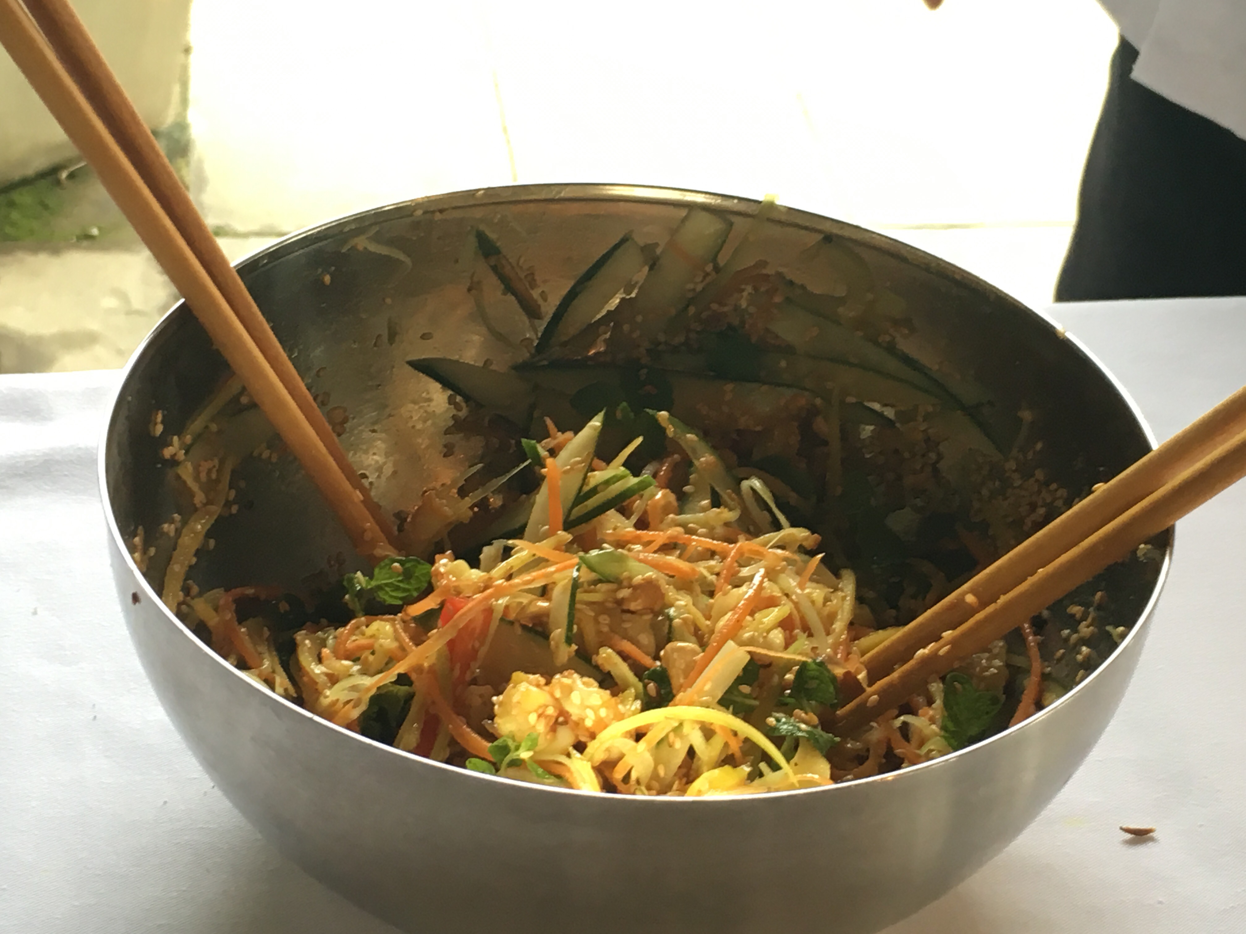 Pancake w rice flour, veggies & greens, prawns as demonstrated by our chef/teacher Mimi