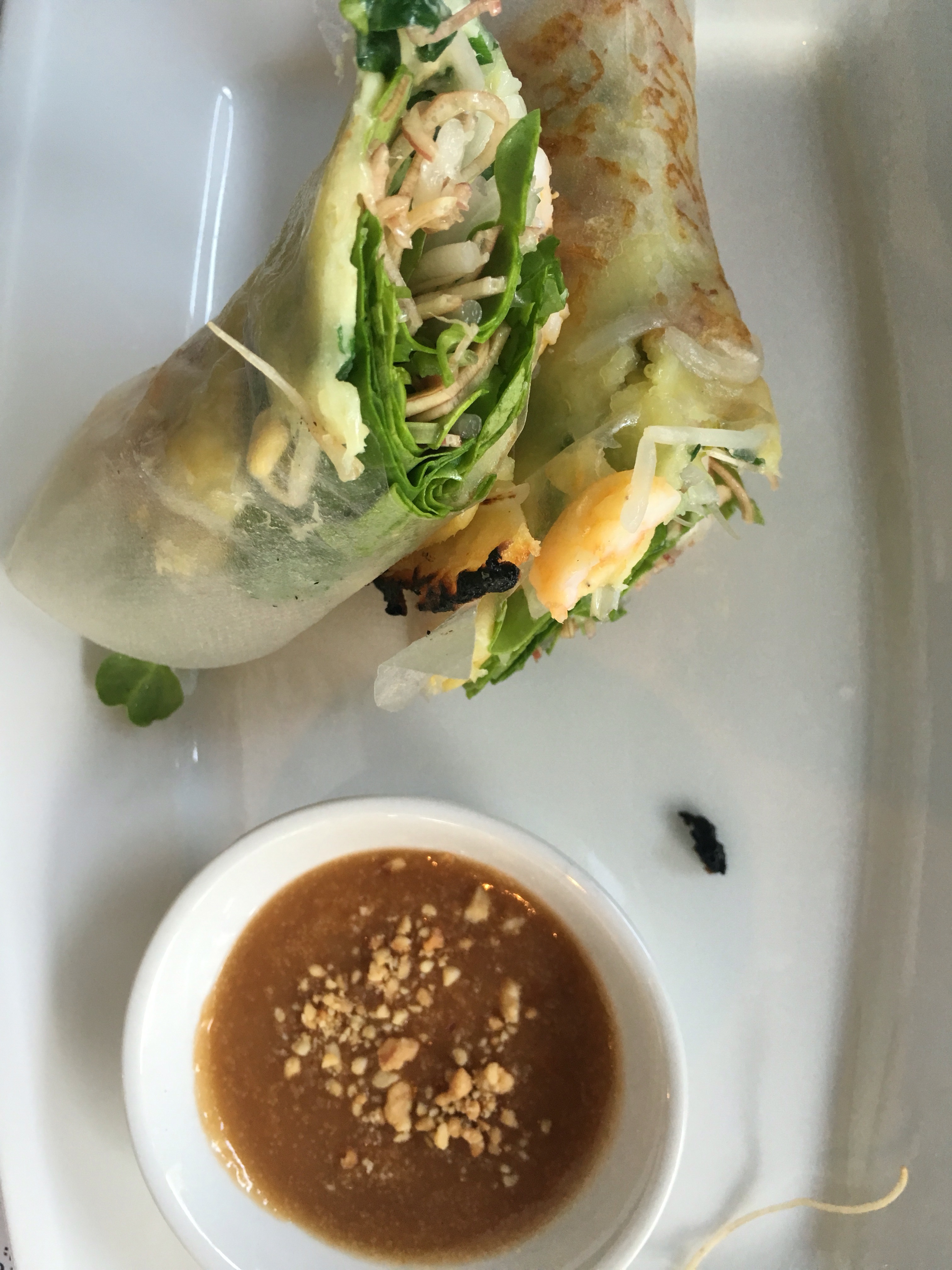 Rolling pankcake in rice paper w greens, basil, mint, bean sprouts, etc.