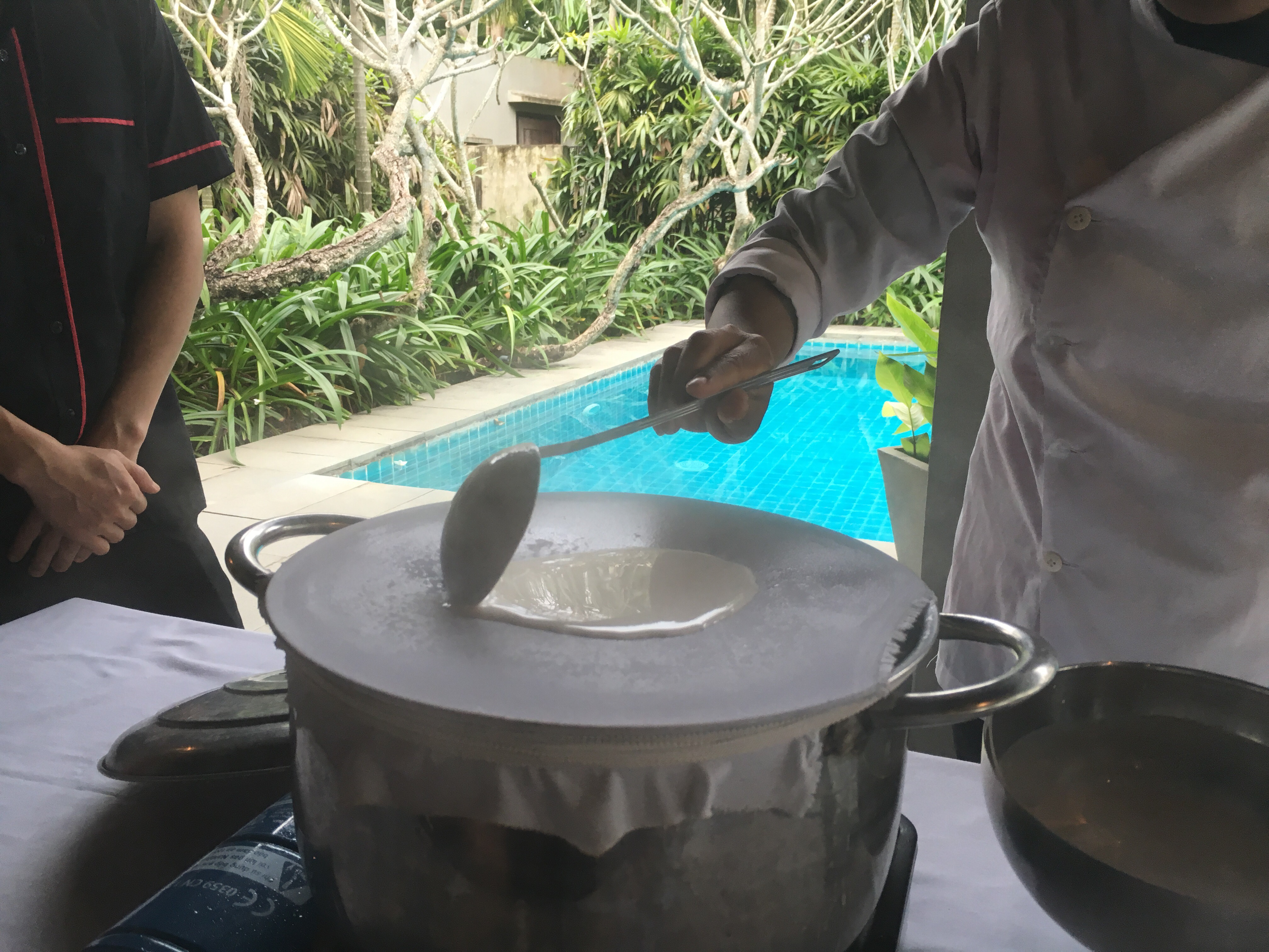 Amy & I made the green curry paste – she diced the veggie/flavor additions & I crushed peppers and then her ingredients in a massive mortar & pestle. I hadn’t realized I’d get a good arm workout in cooking class as this was hard work to crush everything into a fine paste… Prob took 20+ minutes, all the while Gun continually demanding “stronger, faster, not ready yet” w a devious smile. We each made our own soups and then I volunteered (yes! In a cooking class!) to cook the coconut sticky rice for everyone and knocked it out like a pro. Haha