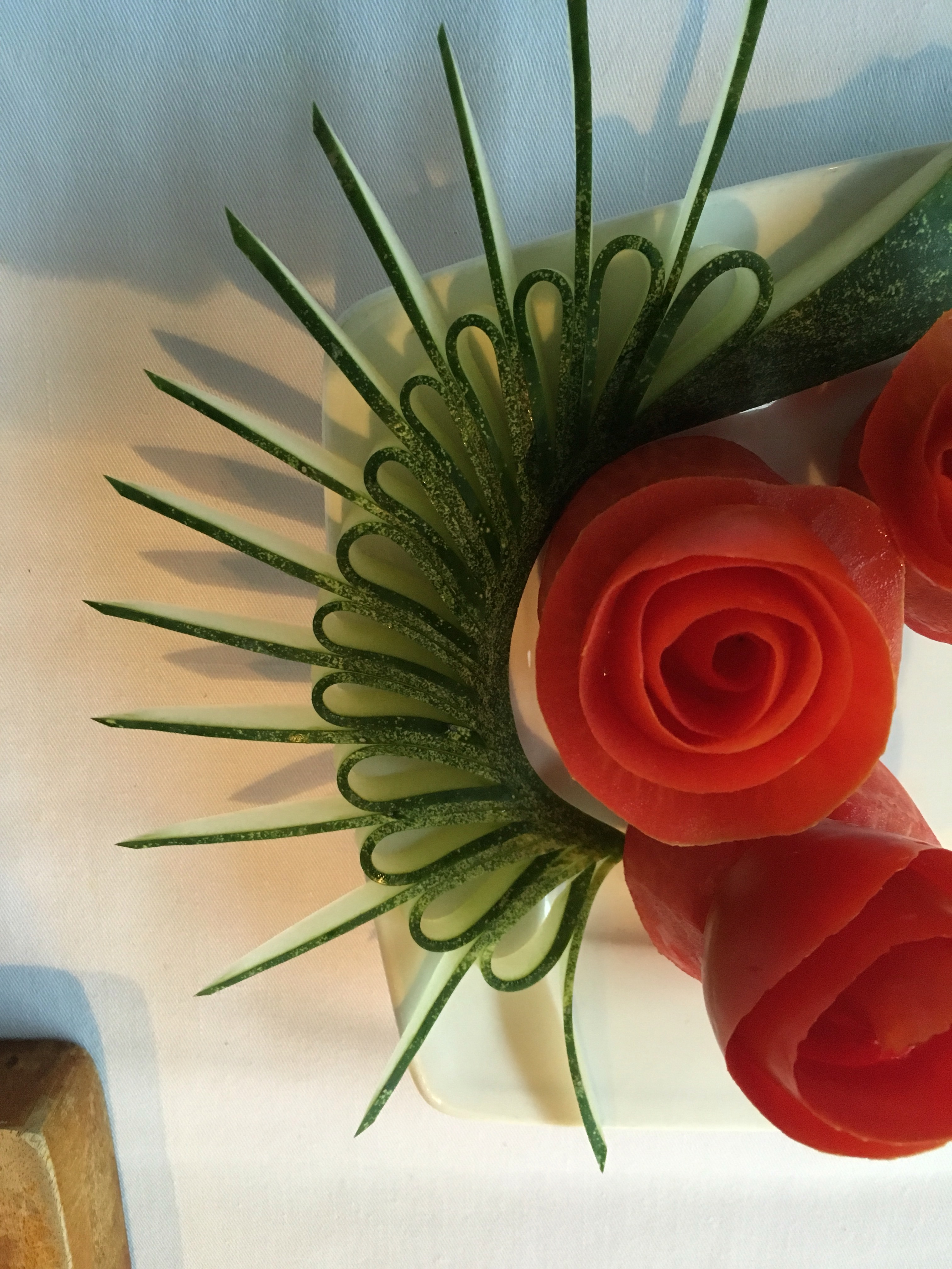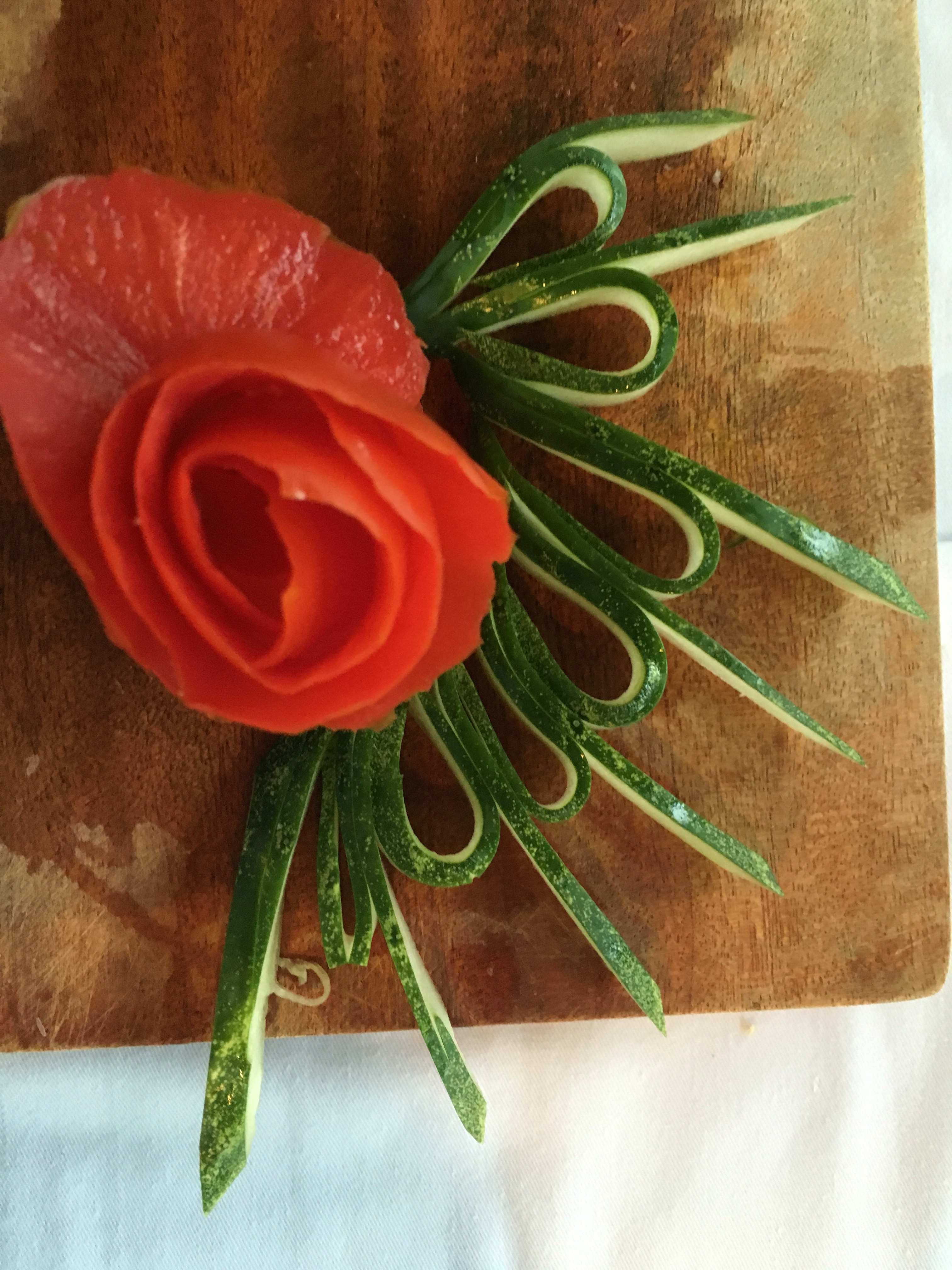 We cooked 1 first and promptly ate it (& everyone commented on my great knife skills as I had the best sliced carrots in our group of 6… I apparently brought my A game). We then cooked 2 & 3 and ate those together as course 2 and after, took a 1 hour break on the lovely grounds. Amy & I played cards and chatted while the cooking school staff prepped for the afternoon’s meals.