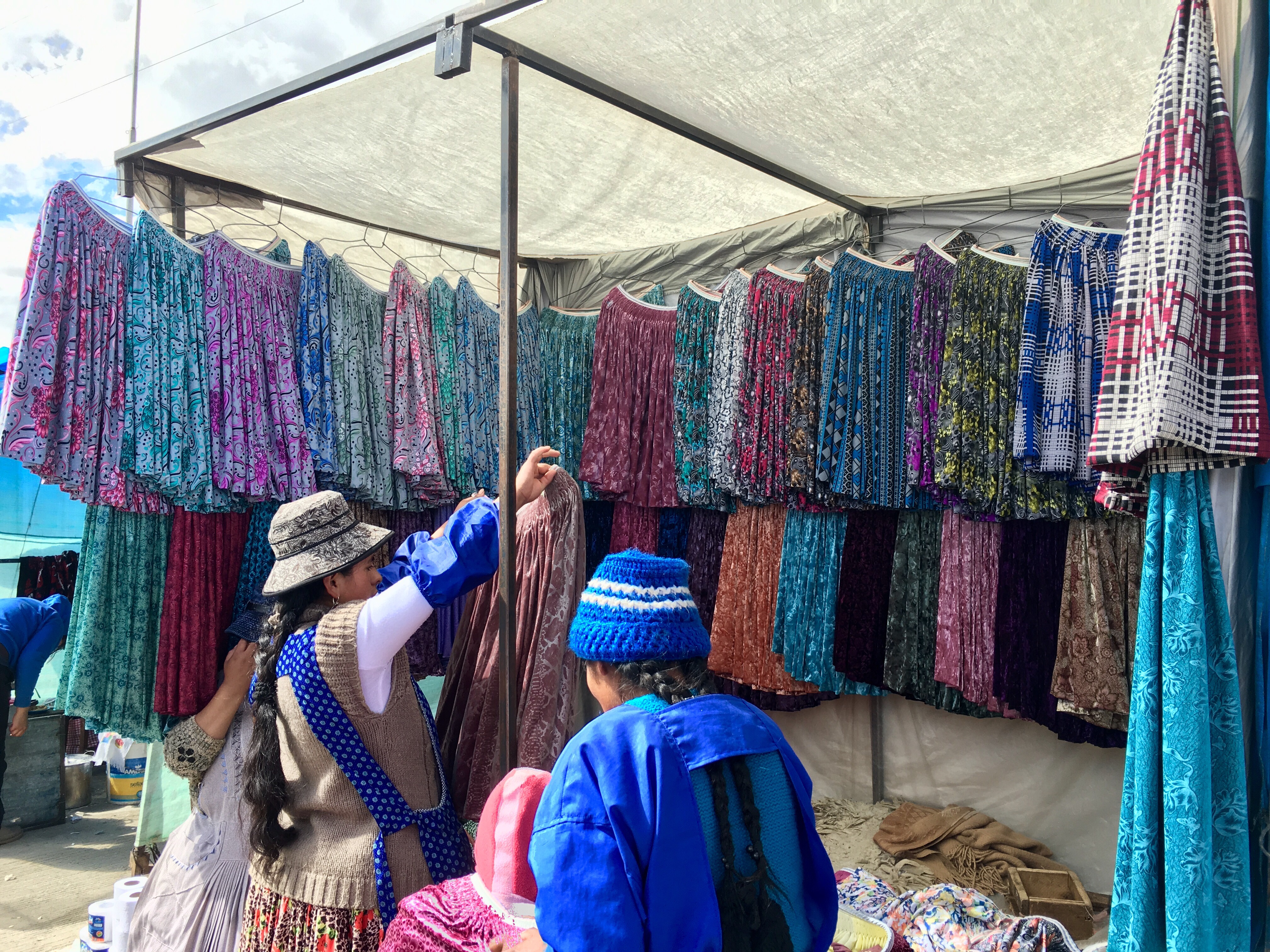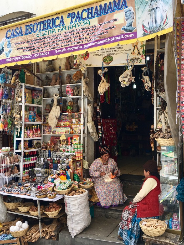 The city, at 3500m, it situated in a canyon surrounded by mountain peaks.Mountains mountains everywhere. The only way to gain perspective on how big the city is & for the best mountain views, hop on the dope new telefericos. The city is still adding lines so they don’t all get connect but it’ll be soon.One of the main city squares always jammed w people. It’s bisected by the massive main thoroughfare, El Prado.During the La Paz visit, we were lucky enough to witness the fiery spirit of Bolivians as rural coca farmers staged protests of new laws increasing competition by shutting down the massive main thoroughfare El Prado. For the most part it was a quiet seated peaceful protest but for the occasional fireworks. The resulting traffic was gridlocked but as we were strictly pedestrians wandering the city, it didn’t impact us. I rather enjoyed walking down the middle of the street with no cares. We visited the coca museum (duh) & afterwards sampled some beverages from the coca museum’s bar. The “original recipe” for Coca Cola featured cocaine but I’m almost positive the drink just included a shitload of coca. And also coca beer cuz why not? They were both delicious.Massive Sunday markets. These tented stalls scattered in every direction for blocks & blocks.The tented stalls sold everything from unattractive oddly fitting & unflattering length skirts that every local woman wears (like above) to auto parts, school supplies, etc. You name it, they had it.The market also featured this odd little building housing witches. Each door was a separate witch’s lair / witch’s haven (?!?! I’m not up on my witch lingo!) where you can have your fortune read & other good stuff. You know if they’re open for business if there’s a fire burning outside. It seemed like a slow day for the witches as there wasn’t much activity but we finally found a fire (which was a little disturbing… something may have previously been alive). So we knocked to see if they were available, but there was someone ill inside (& it was really creepy) so we moved along. Perhaps it’s more of a night thing?So instead we went to this way more accessible witch hangout as there’s this little street known as “Mercado de hechiceria” – or witches’ market. So we found a stall we liked & disappeared inside to wander around. There’s weird shrunken llama heads & a random assortment of remedies, potions, herbs, etc. it’s so cool.At first I intended to ask for a remedy for my horrendous cough. Then after snooping around a bit, I thought better. Instead I gave the witch a problem to solve – that didn’t involve me ingesting weird things – attracting a man. Bwah haha. Somehow I said it with a straight face cuz I need a guy just about as much as I need a hole in my head but boy did she go to work. She sorted through her stash to offer me several items. It was so much fun so I ended up buying this crap to show her my appreciation. It included a couple potions (or essential oils I typically use as perfume) & a tiny gold amulet (which seemed to be a couple amorously embracing) wrapped with neon pink died llama hair for good luck.You can find help for your colon right next to some sort of bedroom performance enhancement.We sought out the best resto in La Paz & enjoyed a fabulous tasting menu. The resto is Gustu, the sister resto of Noma, the Copenhagen resto consistently ranked as world’s best. So obviously the Dane joined us & was super excited. Quite possibly my fave part of the whole experience was the cocktail I started (& ended) with. Gin (what else!?!), cucumber & smoked rosemary (that you smell after unscrewing the capped jar & then pour the gin & cucumber mix on the smokey ice). The name? A Fucking Cocktail. And yes, I REALLY enjoyed ordering it.The mix. Maybe one of my other fave parts of the resto visit, again besides the food? I’m pretty sure a famous boy band was eating there at the chefs table & then having drinks after while we lingered. They kinda looked the type – you know, boyishly handsome. Not many young guys splurge on a fancy dinner like that. People – patrons & the staff – were making quite a bit of fuss. But I don’t have a fucking clue. I’m not up on my boy bands. All I know is the staff gave us free drinks after dinner so they weren’t the only fun group dining that night.