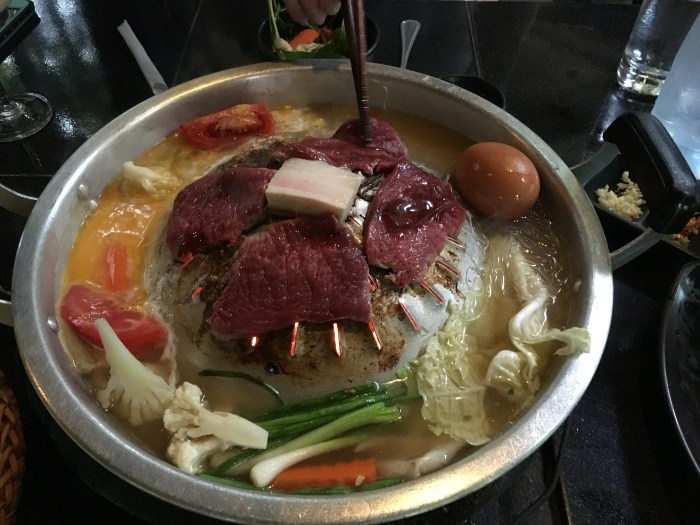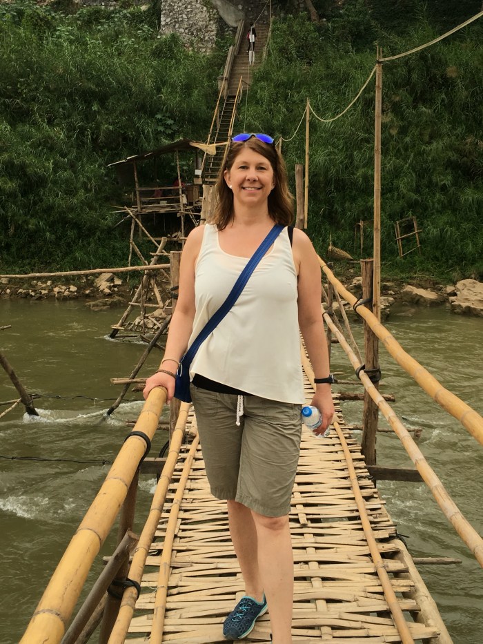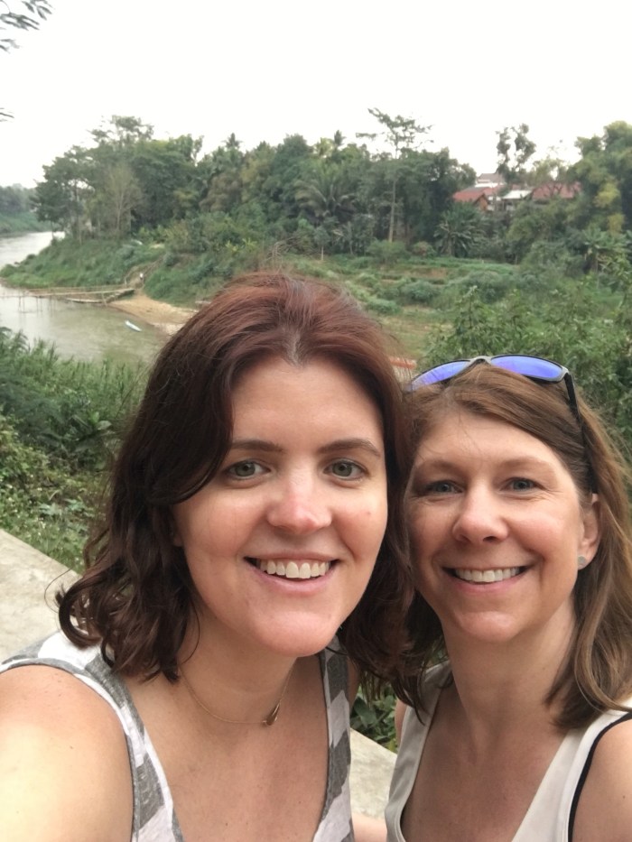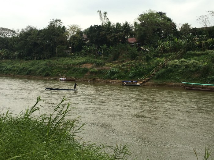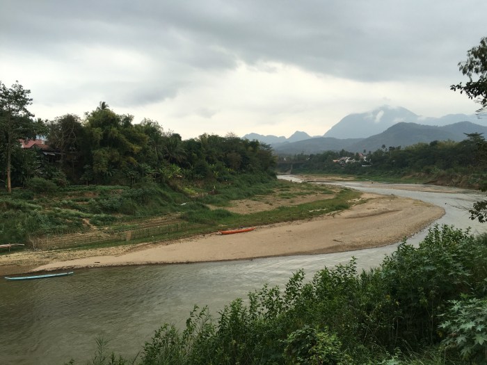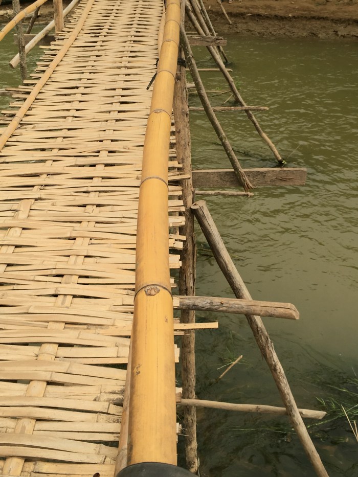 The highlights of the day included a walk across a man-made bamboo bridge that is erected over the Nam Khan every November in dry season bc it washes away every June in the high waters that come with the wet season. Despite being constructed entirely of bamboo, and the fact it has only a 6 month lifespan, it’s supposedly pretty solid and can support the weight “of several people at once” so Amy and I jumped at the chance to pay 5k Kip to cross the bridge (the funds go toward rebuilding next year’s bridge). It felt pretty solid. And seemed otherworldly it was so picturesque. We found on the other side of the river, a great resto nestled in the lush woods and proceeded to sit for 2+ hours enjoying amazing local Lao fondue (our server told us every Lao household has a fondue pot used when special company visits), cocktails featuring the local Lao whiskey (Lao Lao), the local beer (BeerLao), and a few games of gin.