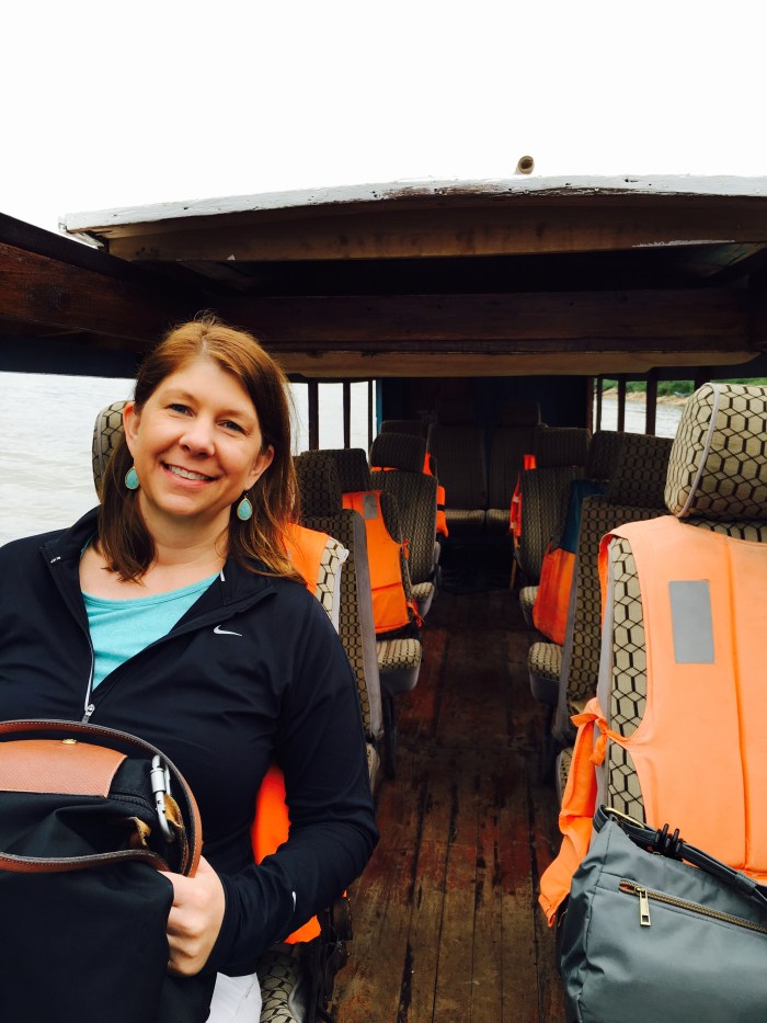 We negotiated w a cute Laos boat captain, Mr Sing, for a day trip to Kuang Si waterfalls and Pak Ou caves via a Mekong river cruise. We arrived at the river bank and boarded our apparently private large long boat (we had just assumed he’d try to fill the rest of the boat… but we’ve found Laos people to be more honest and less apt to scam you than Thai folks). Despite the weather being a bit on the cool side (70), with some intermittent light rain sprinkles early in the morning, we were real excited for the trip. The boat was a convertible as the roof slid open (we enjoyed after the rain ceased), it was equipped w old airline seats that recline (which made for a very comfortable ride), and featured a good sound system (Mr Sing apparently likes to rock out as he played loud local music).