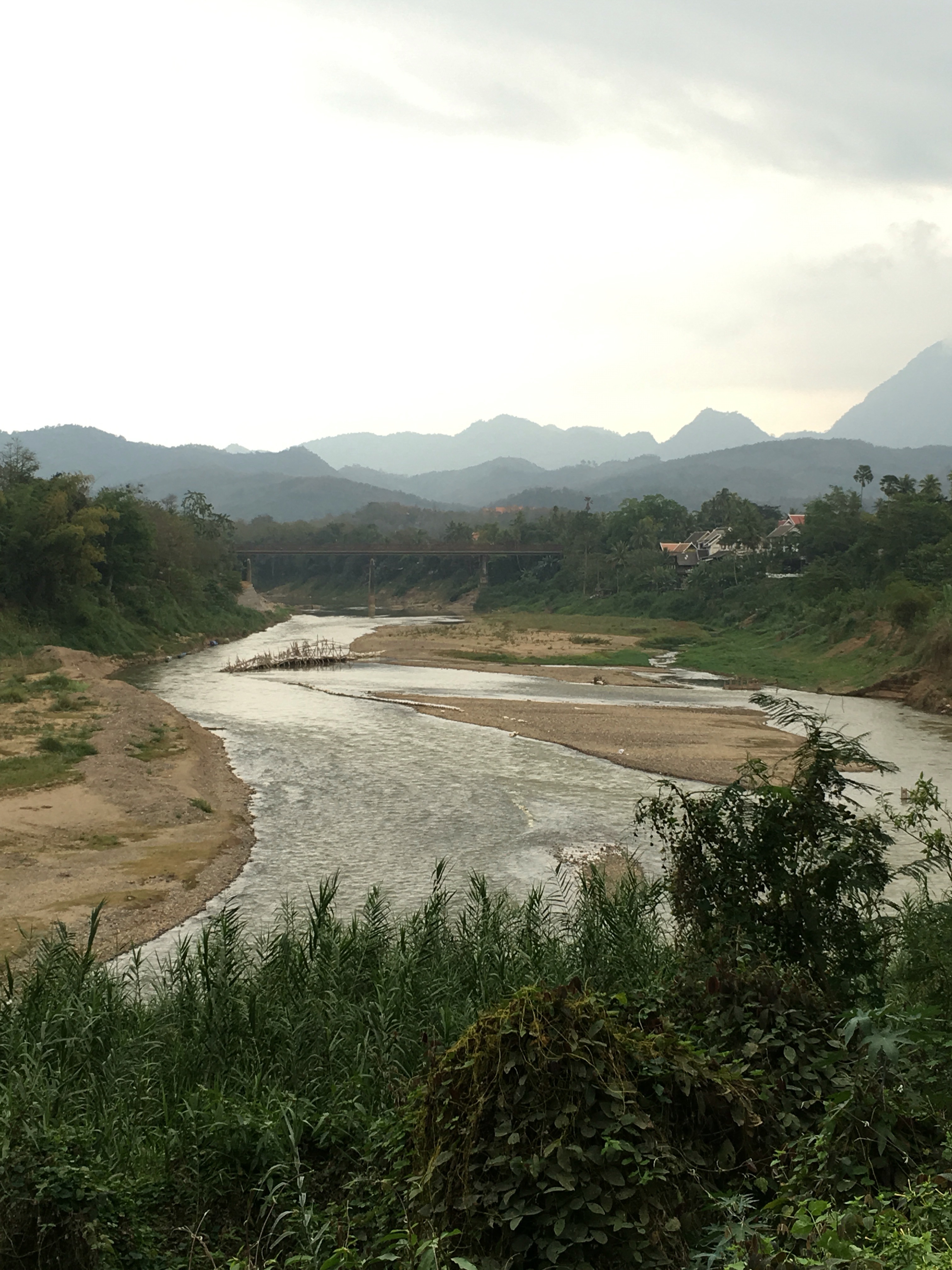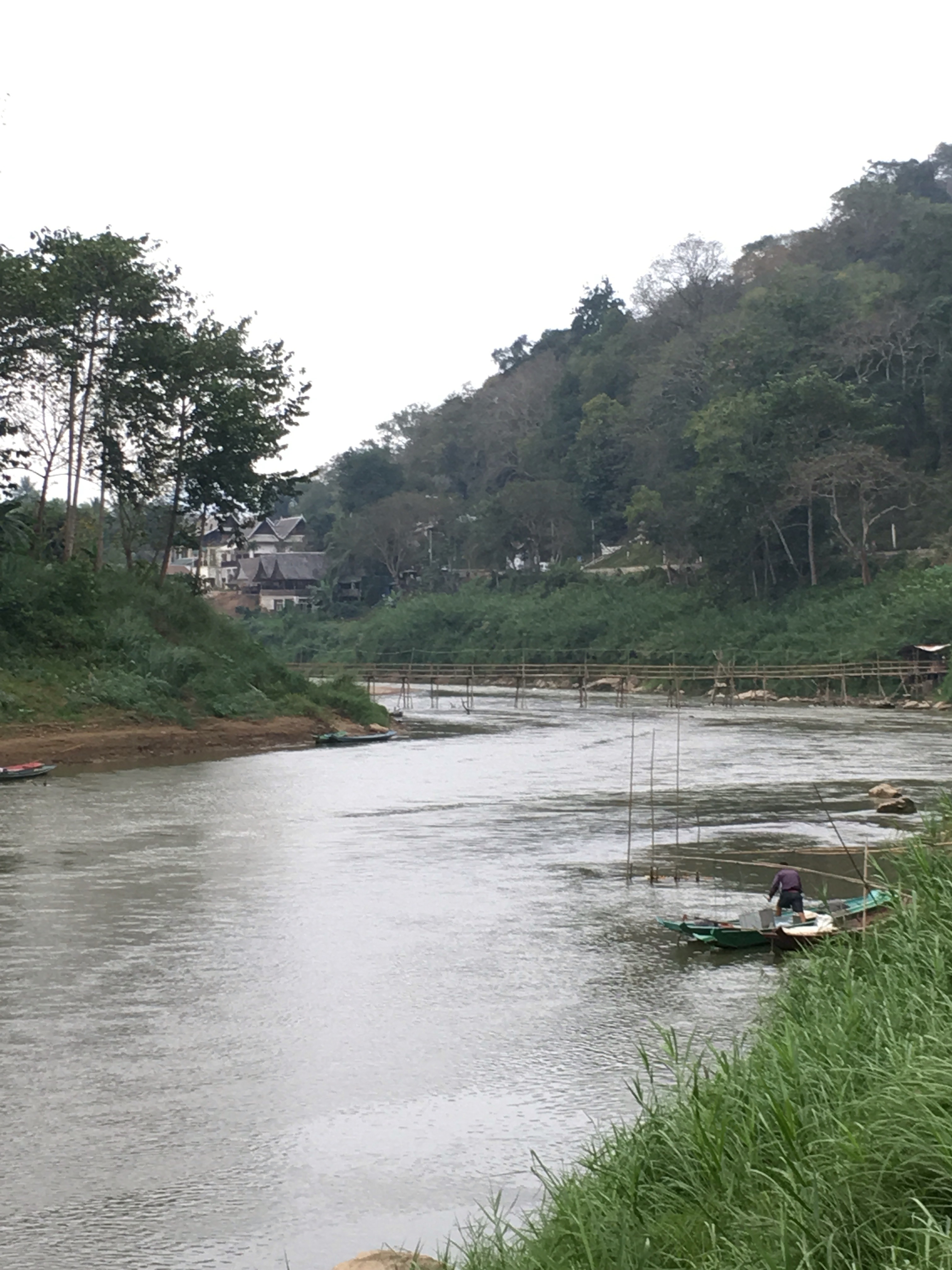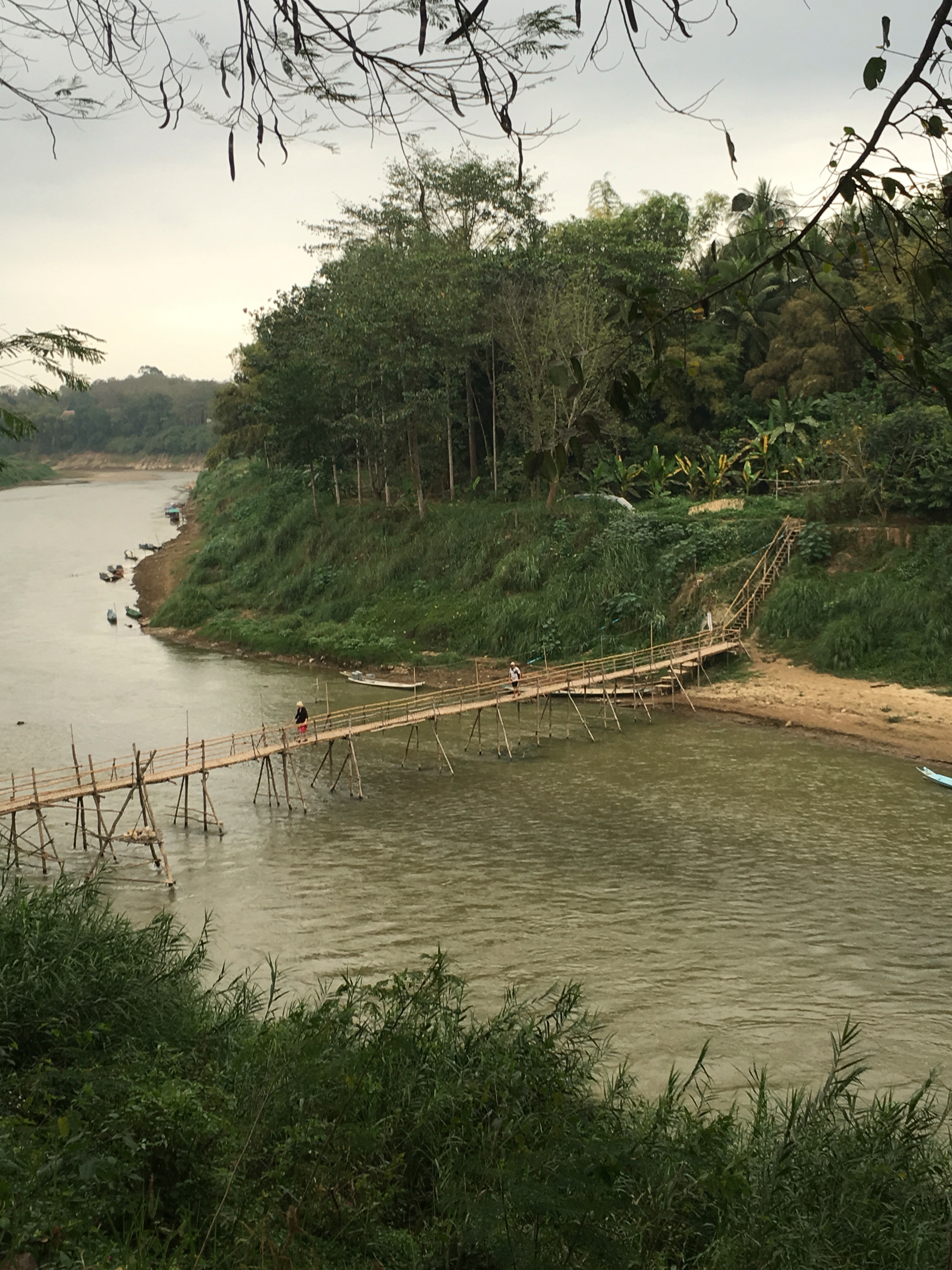 The highlights of the day included a walk across a man-made bamboo bridge that is erected over the Nam Khan every November in dry season bc it washes away every June in the high waters that come with the wet season. Despite being constructed entirely of bamboo, and the fact it has only a 6 month lifespan, it’s supposedly pretty solid and can support the weight “of several people at once” so Amy and I jumped at the chance to pay 5k Kip to cross the bridge (the funds go toward rebuilding next year’s bridge). It felt pretty solid. And seemed otherworldly it was so picturesque. We found on the other side of the river, a great resto nestled in the lush woods and proceeded to sit for 2+ hours enjoying amazing local Lao fondue (our server told us every Lao household has a fondue pot used when special company visits), cocktails featuring the local Lao whiskey (Lao Lao), the local beer (BeerLao), and a few games of gin.