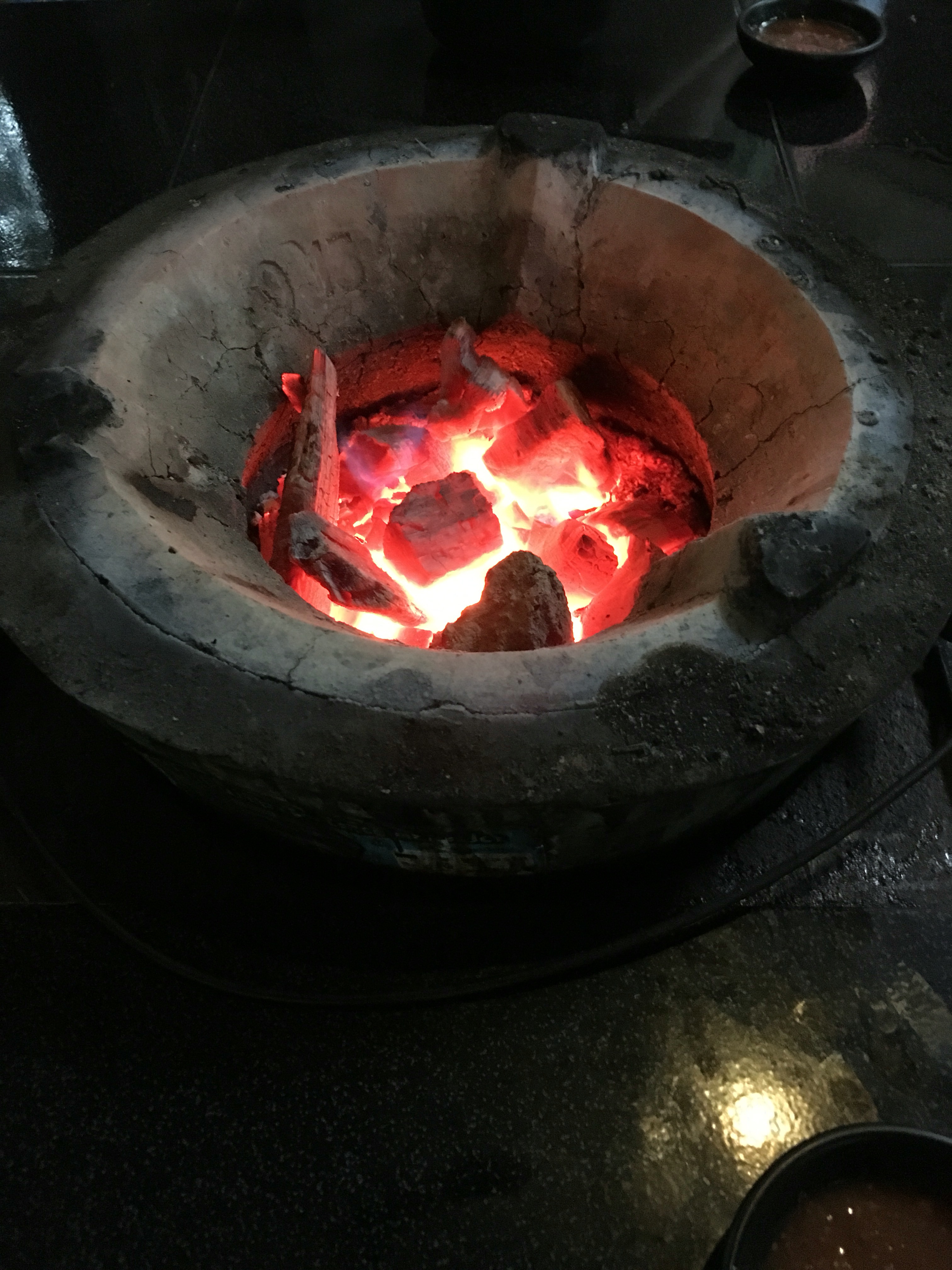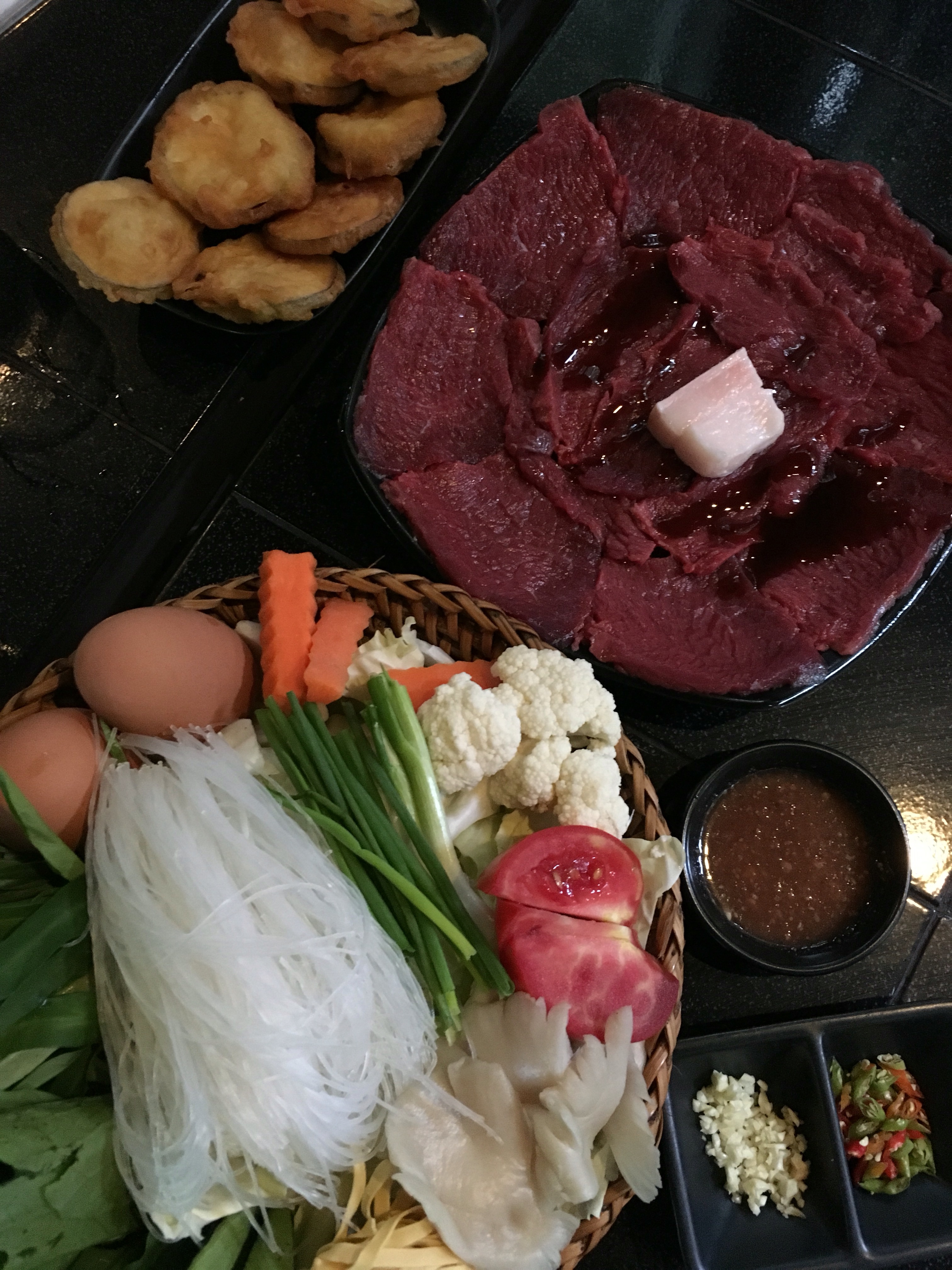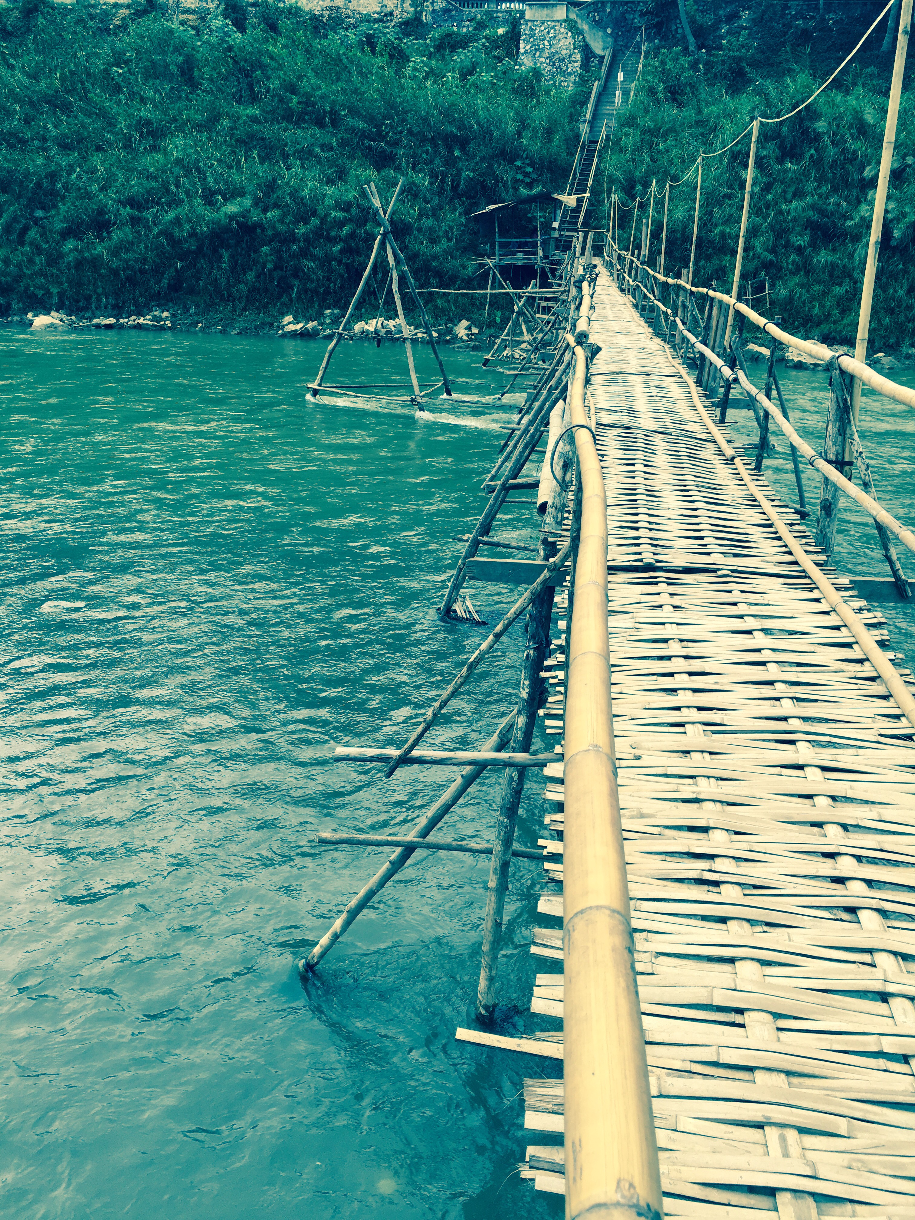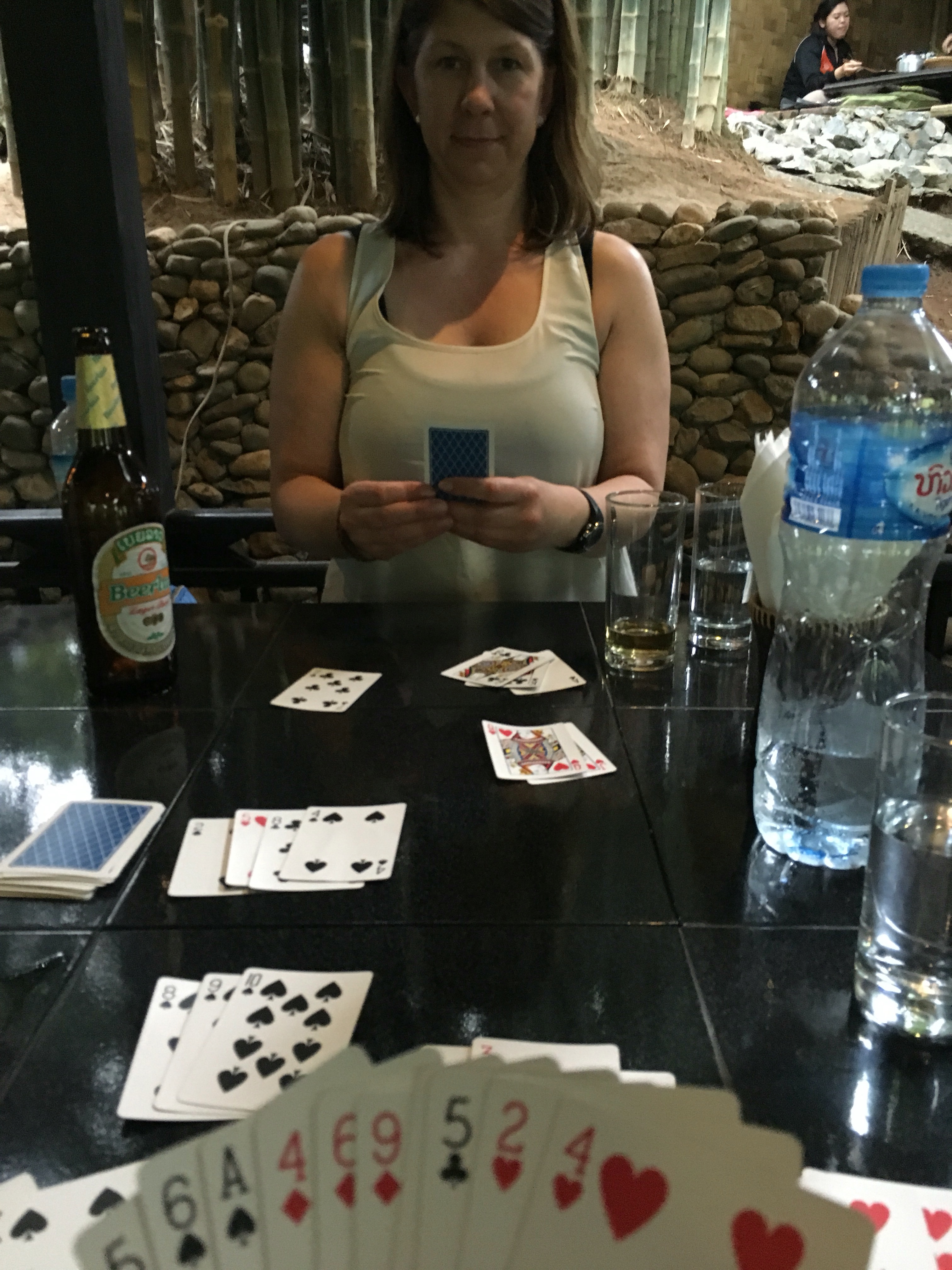 The highlights of the day included a walk across a man-made bamboo bridge that is erected over the Nam Khan every November in dry season bc it washes away every June in the high waters that come with the wet season. Despite being constructed entirely of bamboo, and the fact it has only a 6 month lifespan, it’s supposedly pretty solid and can support the weight “of several people at once” so Amy and I jumped at the chance to pay 5k Kip to cross the bridge (the funds go toward rebuilding next year’s bridge). It felt pretty solid. And seemed otherworldly it was so picturesque. We found on the other side of the river, a great resto nestled in the lush woods and proceeded to sit for 2+ hours enjoying amazing local Lao fondue (our server told us every Lao household has a fondue pot used when special company visits), cocktails featuring the local Lao whiskey (Lao Lao), the local beer (BeerLao), and a few games of gin.