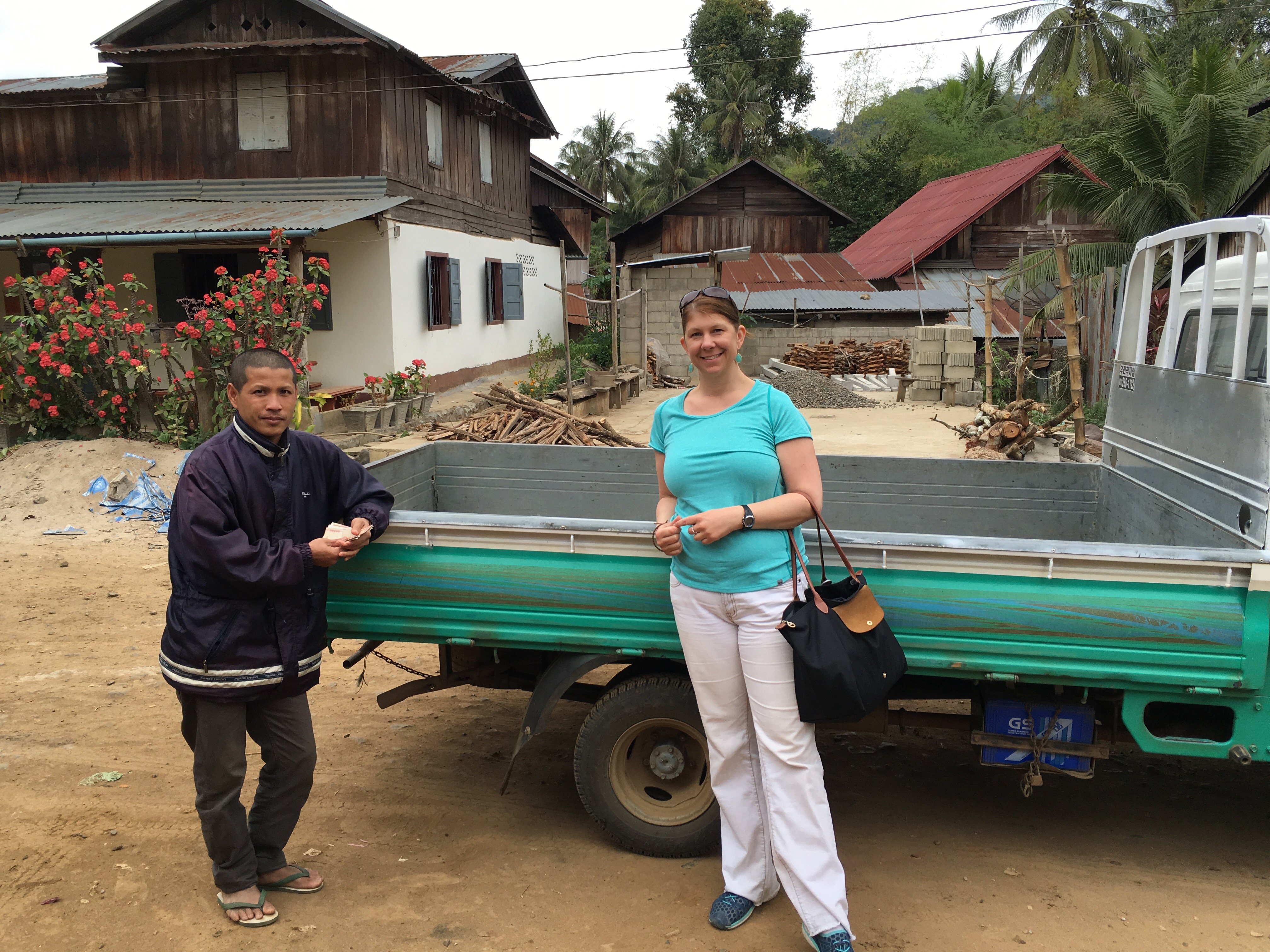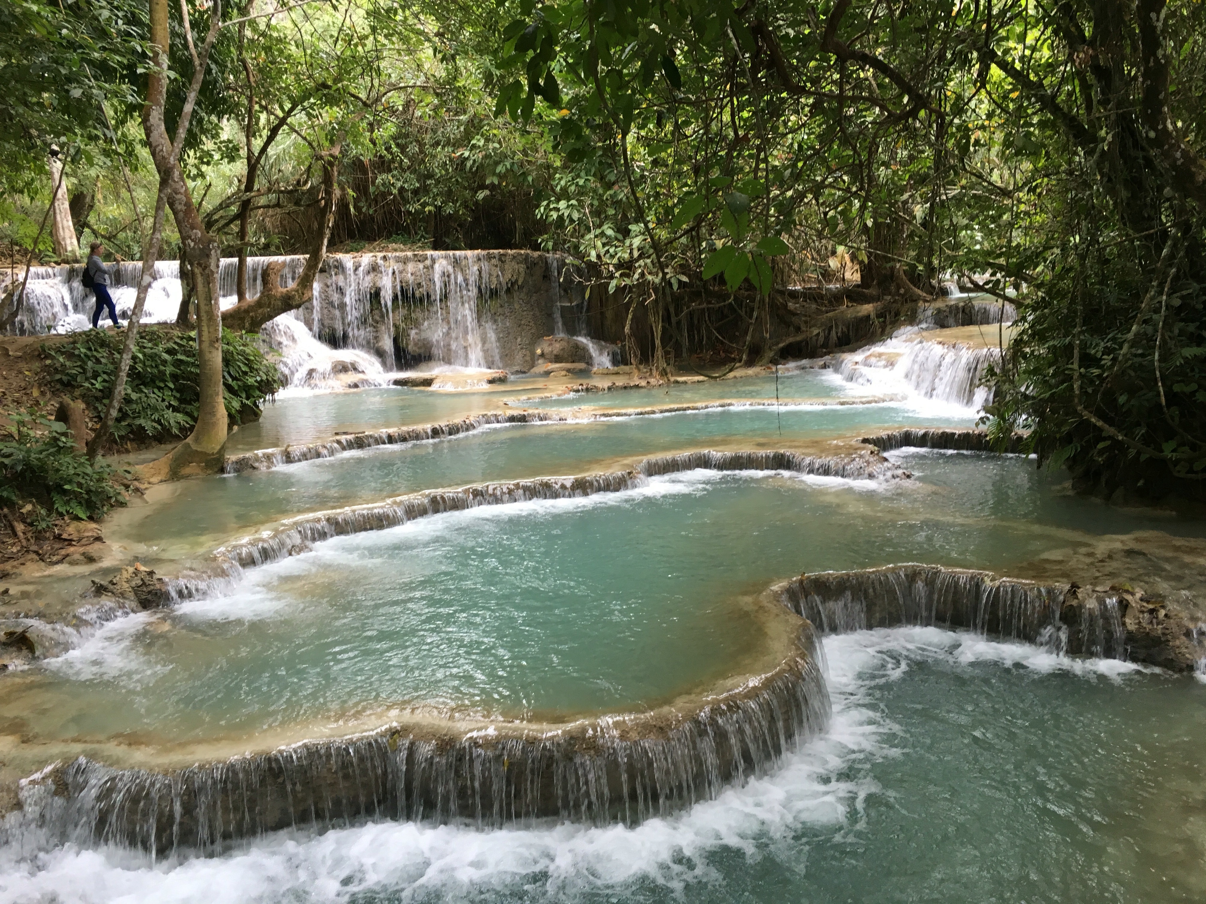The arrival at the falls stop was a bit understated as Mr Sing just cruised up onto a sand bank in the middle of nowhere and “docked”. He then led us past the bank up along a rutted dirt “road” that popped out in a tiny local Lao village. Our captain had previously promised our price included bus transport to the falls. Upon arrival in the little village, Mr Sing began going door to door to find someone to drive us. The answer was a young local guy who had a pickup truck so Amy and I piled in the front seat, Dazed & Confused style. He spoke no English but happily drove us for 80k Kip and the 20 minute drive was gorgeous… passed rice paddies, locals going about their daily business (yes, some carrying 2 baskets w a shoulder pole & wearing the conical hats), kids walking to school, etc. Just a lovely super special snapshot into Lao life. Our driver dropped us and showed me his phone. The time said 9:22pm. Uh oh. “Two hours” I said. He laughed. “You wait here?” He nodded yes so Amy and I were off to the falls.