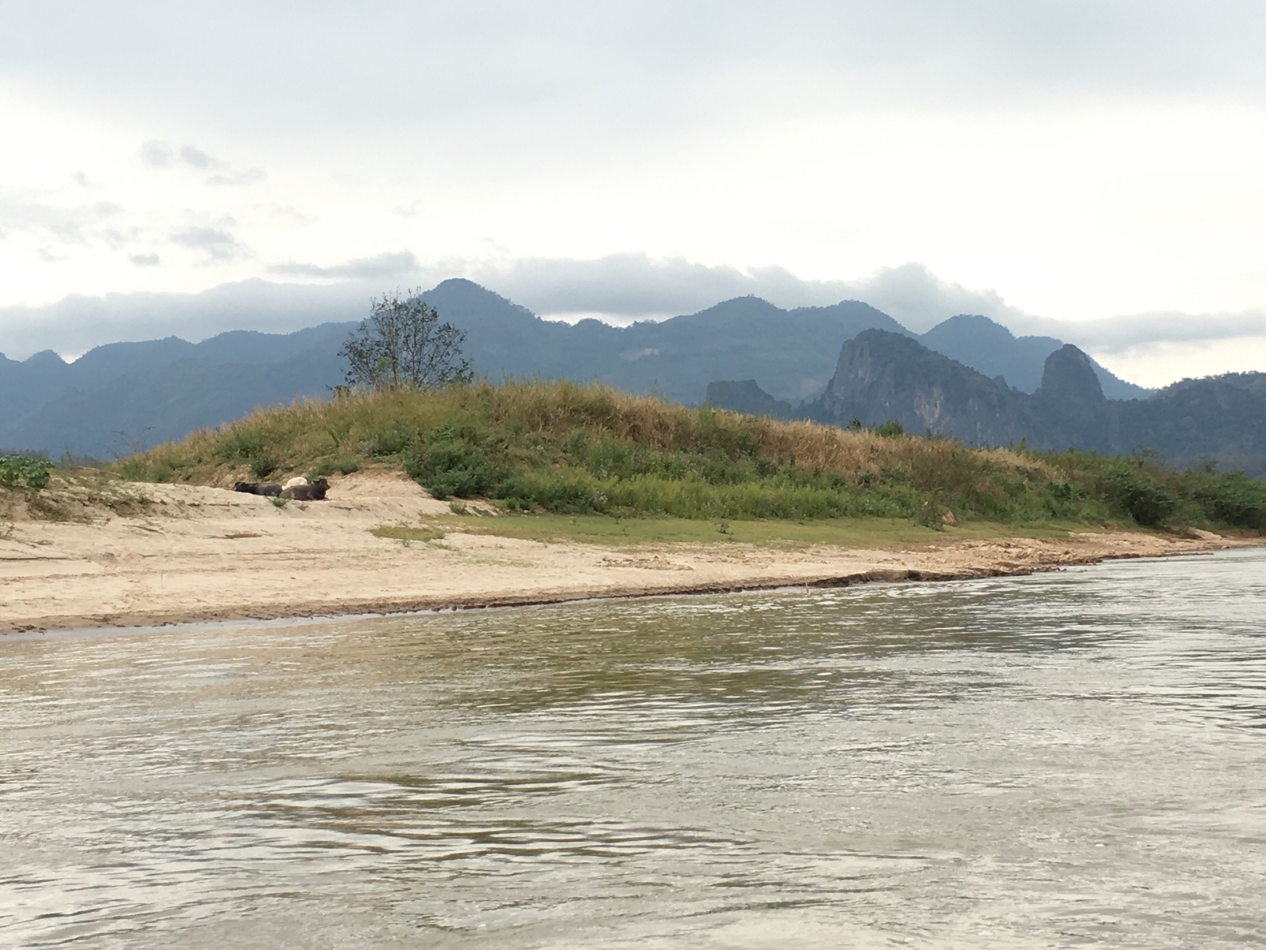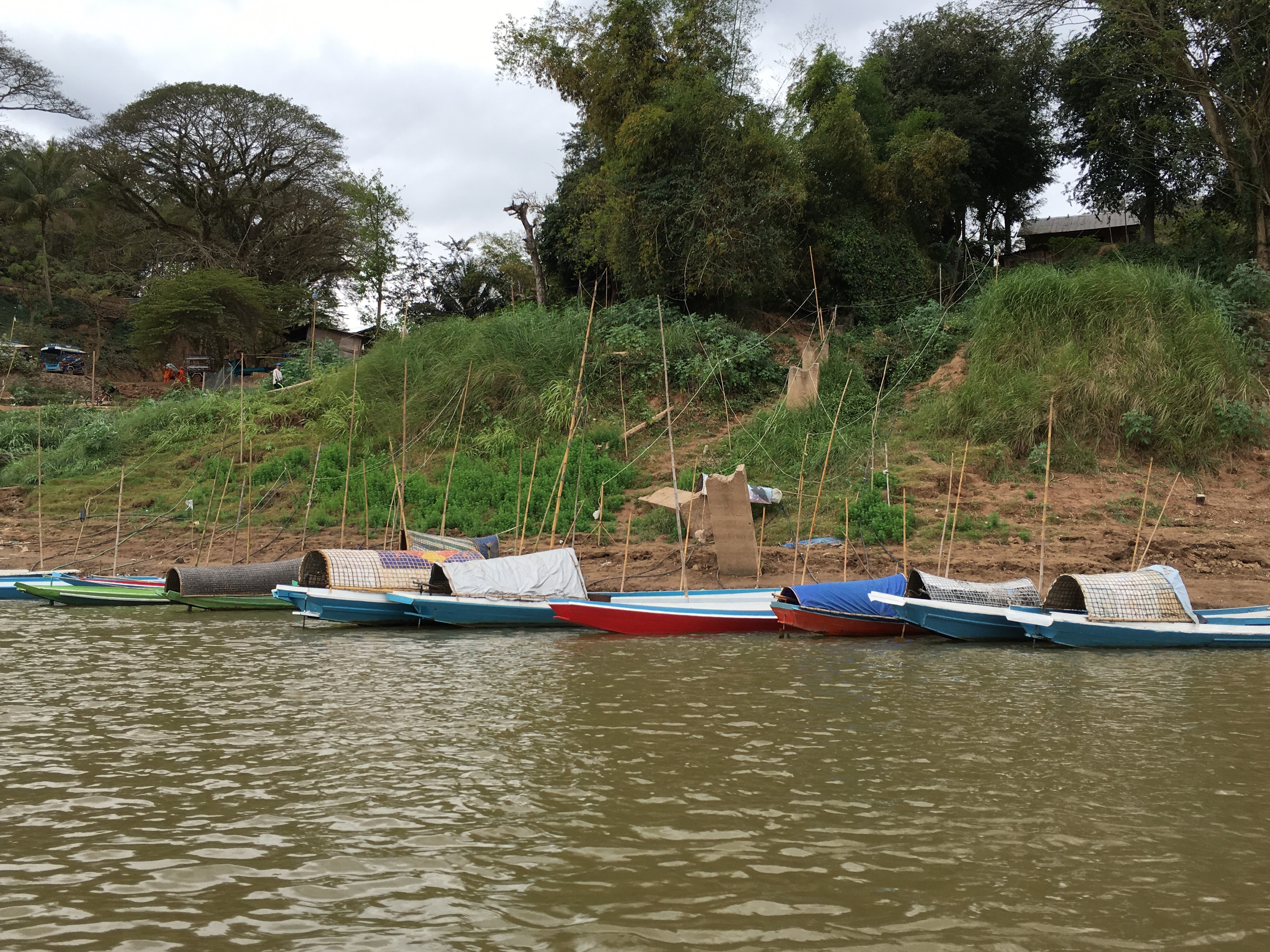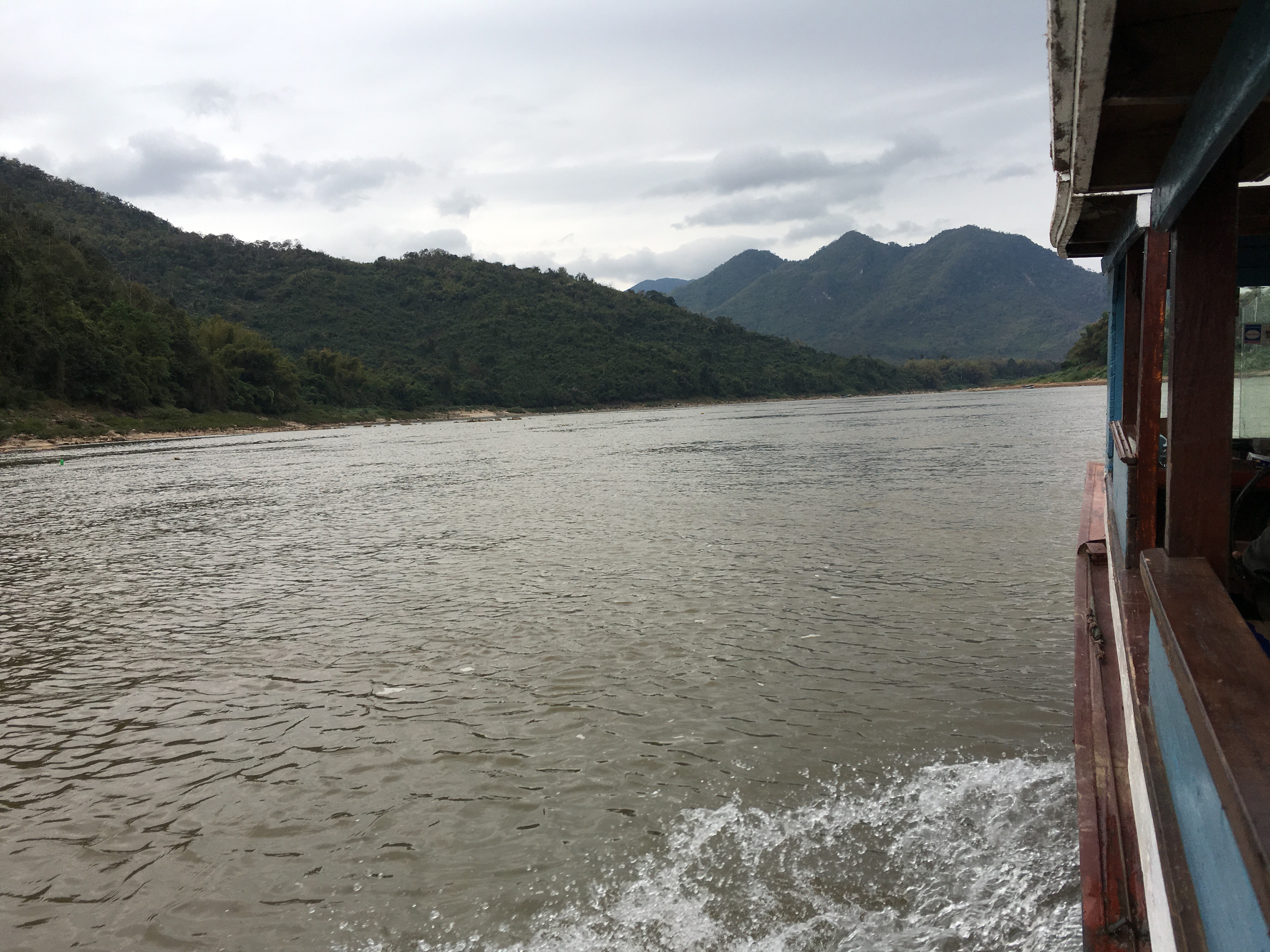 We negotiated w a cute Laos boat captain, Mr Sing, for a day trip to Kuang Si waterfalls and Pak Ou caves via a Mekong river cruise. We arrived at the river bank and boarded our apparently private large long boat (we had just assumed he’d try to fill the rest of the boat… but we’ve found Laos people to be more honest and less apt to scam you than Thai folks). Despite the weather being a bit on the cool side (70), with some intermittent light rain sprinkles early in the morning, we were real excited for the trip. The boat was a convertible as the roof slid open (we enjoyed after the rain ceased), it was equipped w old airline seats that recline (which made for a very comfortable ride), and featured a good sound system (Mr Sing apparently likes to rock out as he played loud local music).