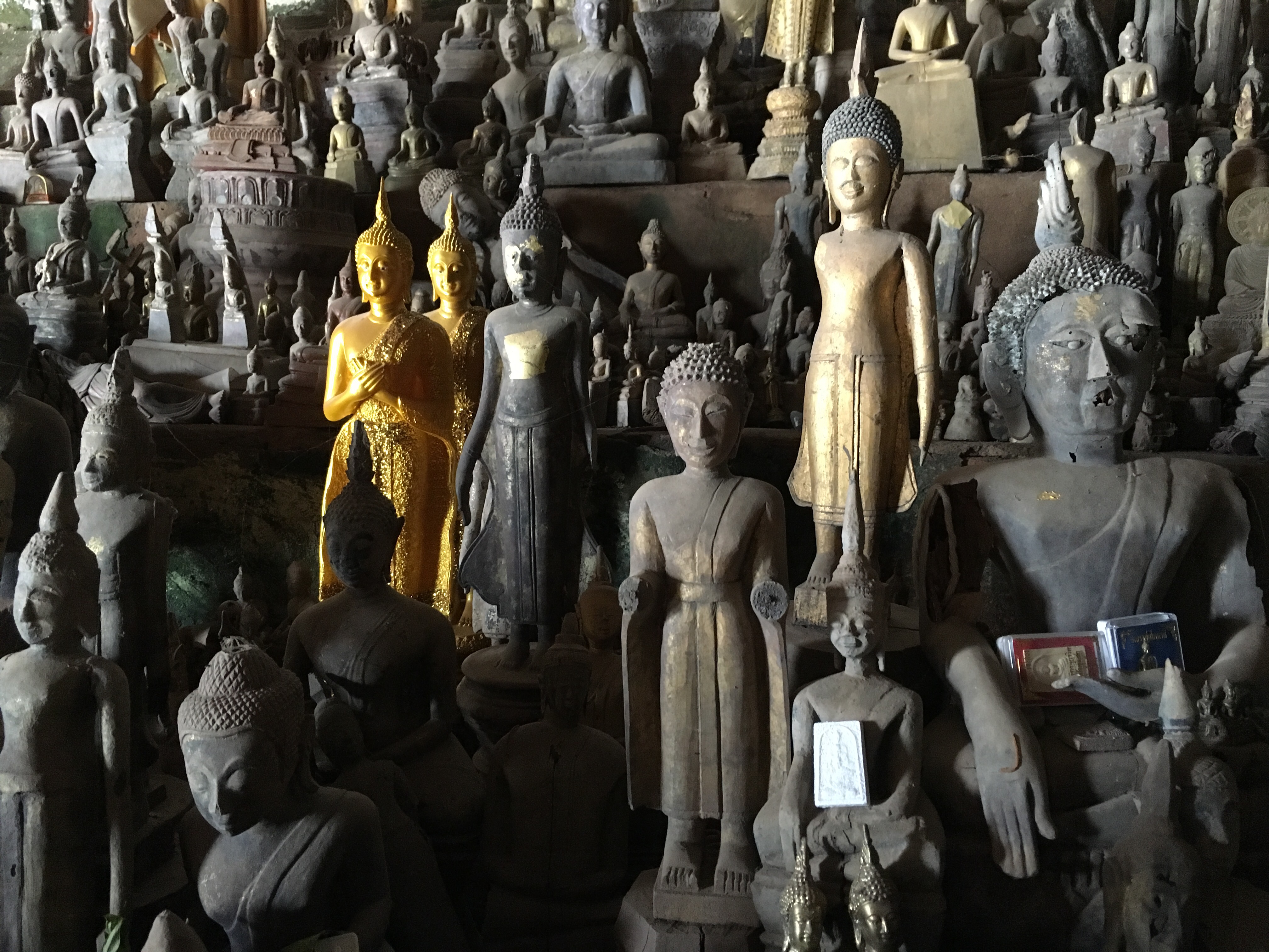 Upon arrival, we hiked up into a large cave that serves as the graveyard for Buddha statues no longer deemed suitable for placement in a temple or those given as offerings by worshippers. So it’s a couple caves full of abandoned Buddha statues. Big and small. I thought it looked like an army of Buddhas was assembling. Clearly these emblems are sacred enough to warrant special placement in a gorgeous cave on an gorgeous island in the middle of the Mekong river, but it was a little creepy, I’m not going to lie.