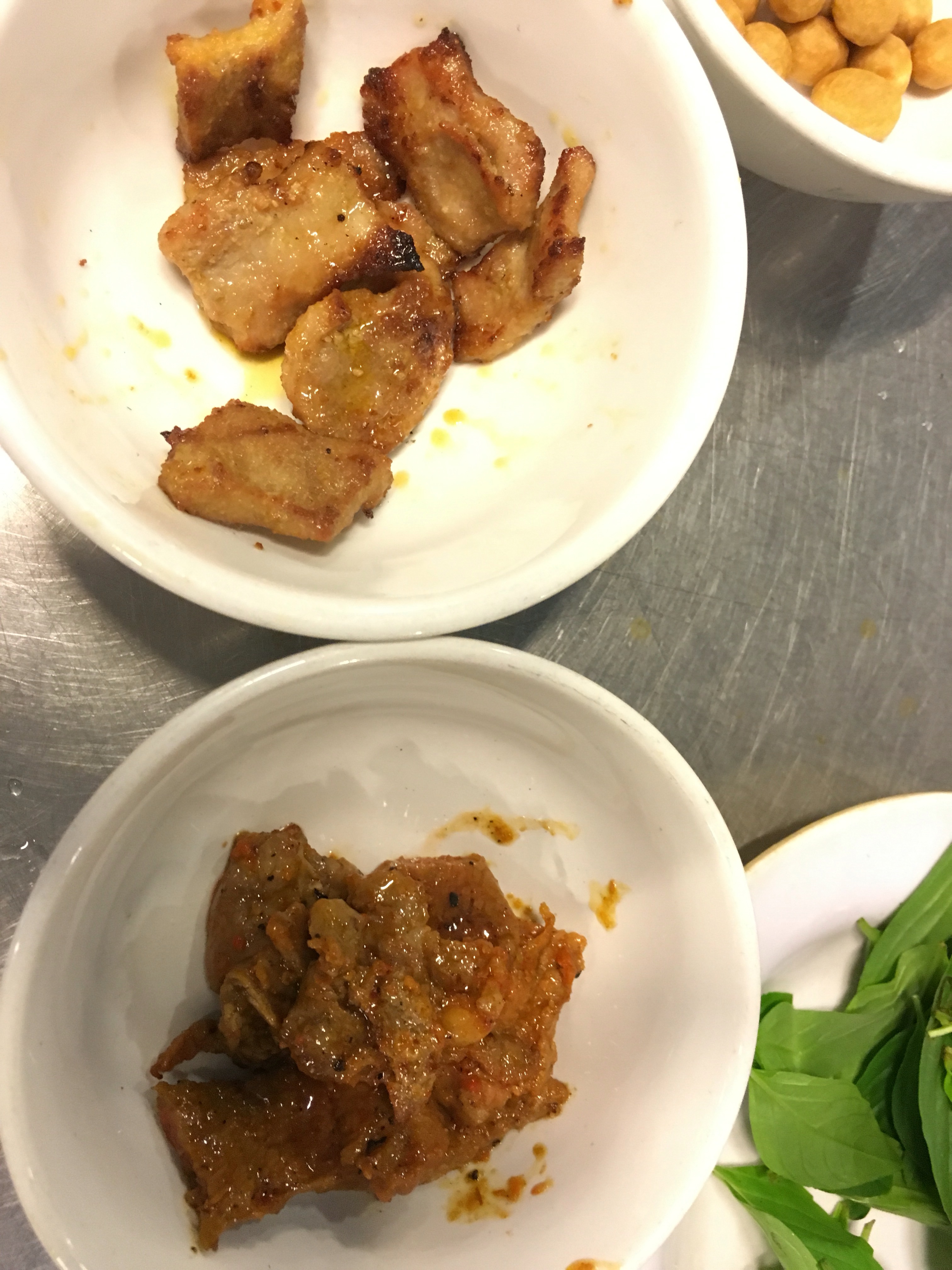 Stop 2 – Thanh Hop restaurant; special pho (pho ga tion); dry pho so no soup; noodles same, mixed w soy sauce, chicken, cucumber, coriander, peanuts; add pickled garlic in vinegar & chili sauce. Called Pho ga tran (dry chicken noodle). I’d never heard of dry pho before & it was fg fantastic!